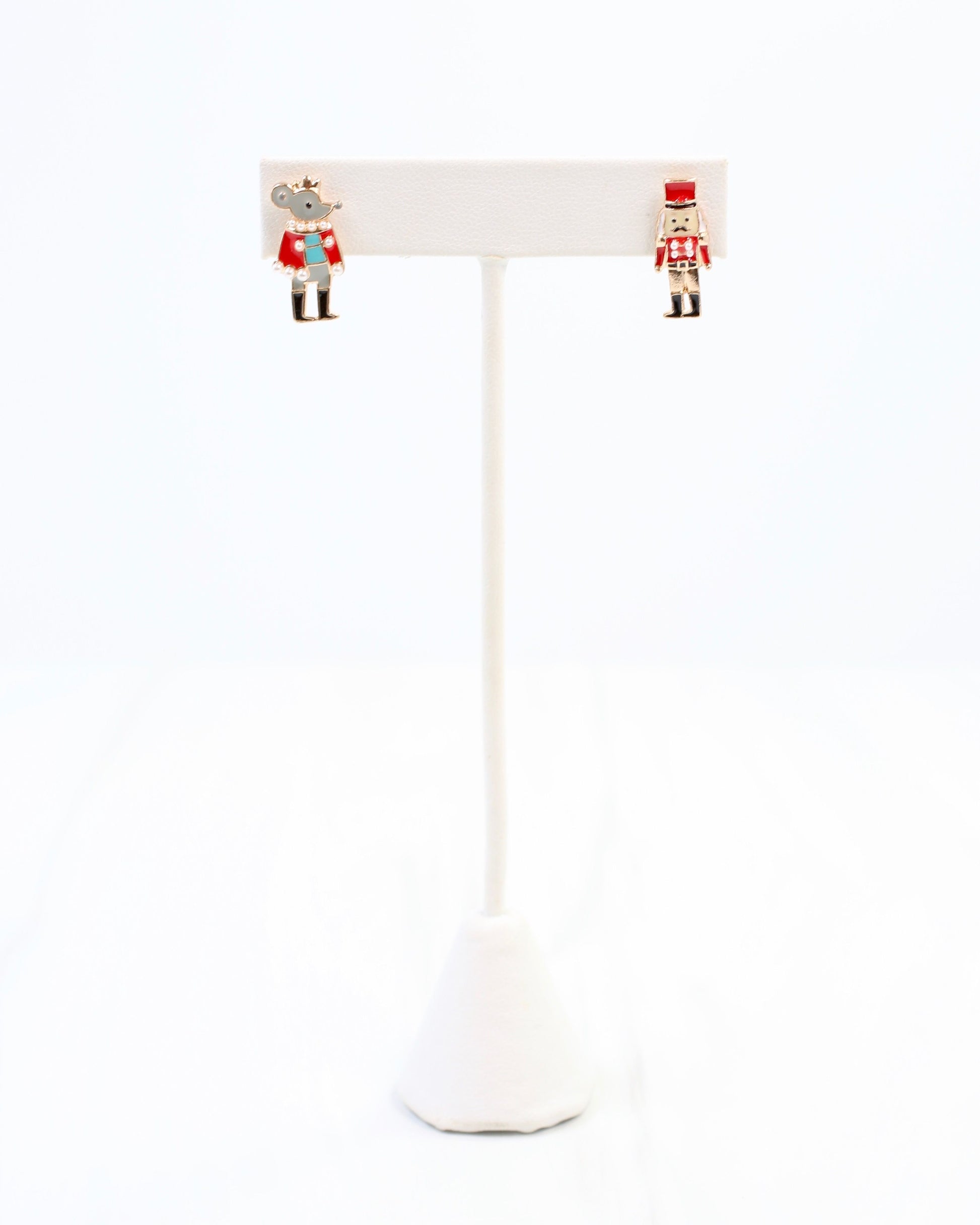 Add a festive touch to your look with the Nutcracker Suite Dreams Earring in Red. Featuring charming small enamel studs of the nutcracker and mouse king, each earring is delicately accented with petite pearls for a subtle, elegant shimmer. Perfect for holiday ensembles or year-round whimsy, these earrings offer a fashionable nod to a classic tale.