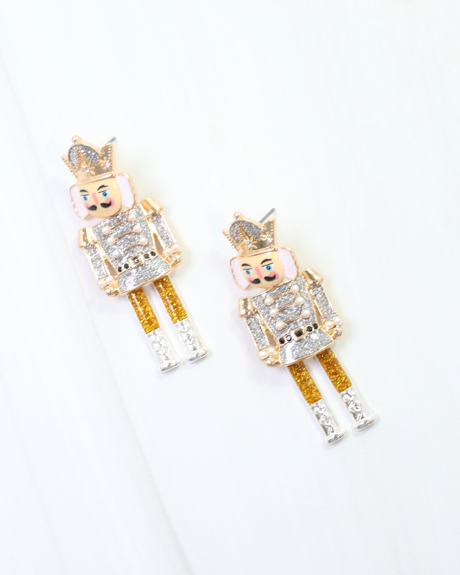 Make a noble statement with the Nutcracker Waltz Earrings in Silver. These glittered dangling earrings feature swinging legs and body that create dynamic movement, adding festive charm and eye-catching style to your holiday look.