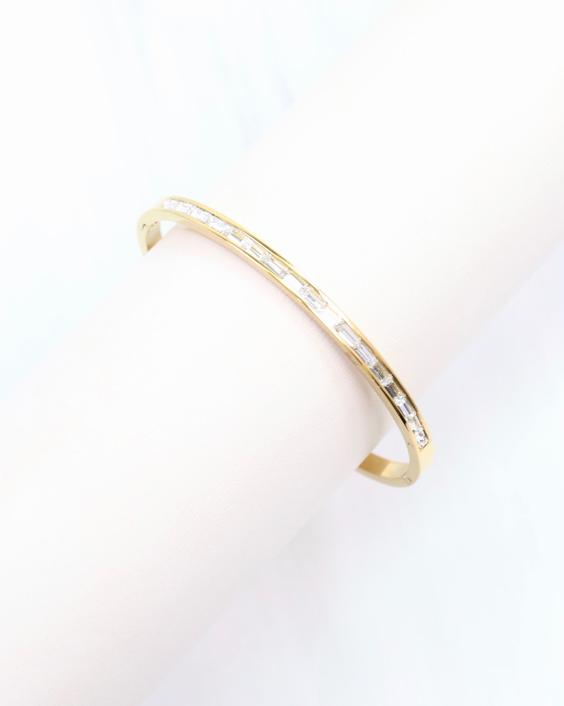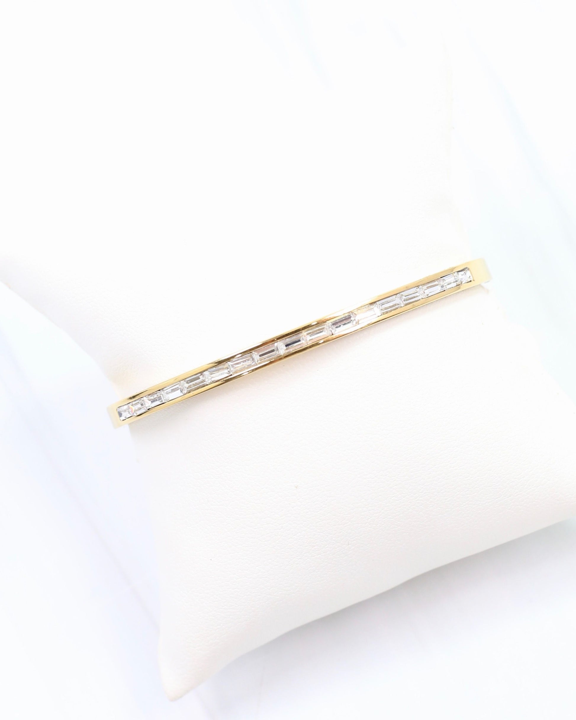 This Nyx Bangle Bracelet in gold features a sleek baguette CZ design and a secure side-hinged tension closure, combining elegance with ease of wear. Its refined style makes it a versatile accessory that complements any outfit while providing a comfortable fit for everyday use.