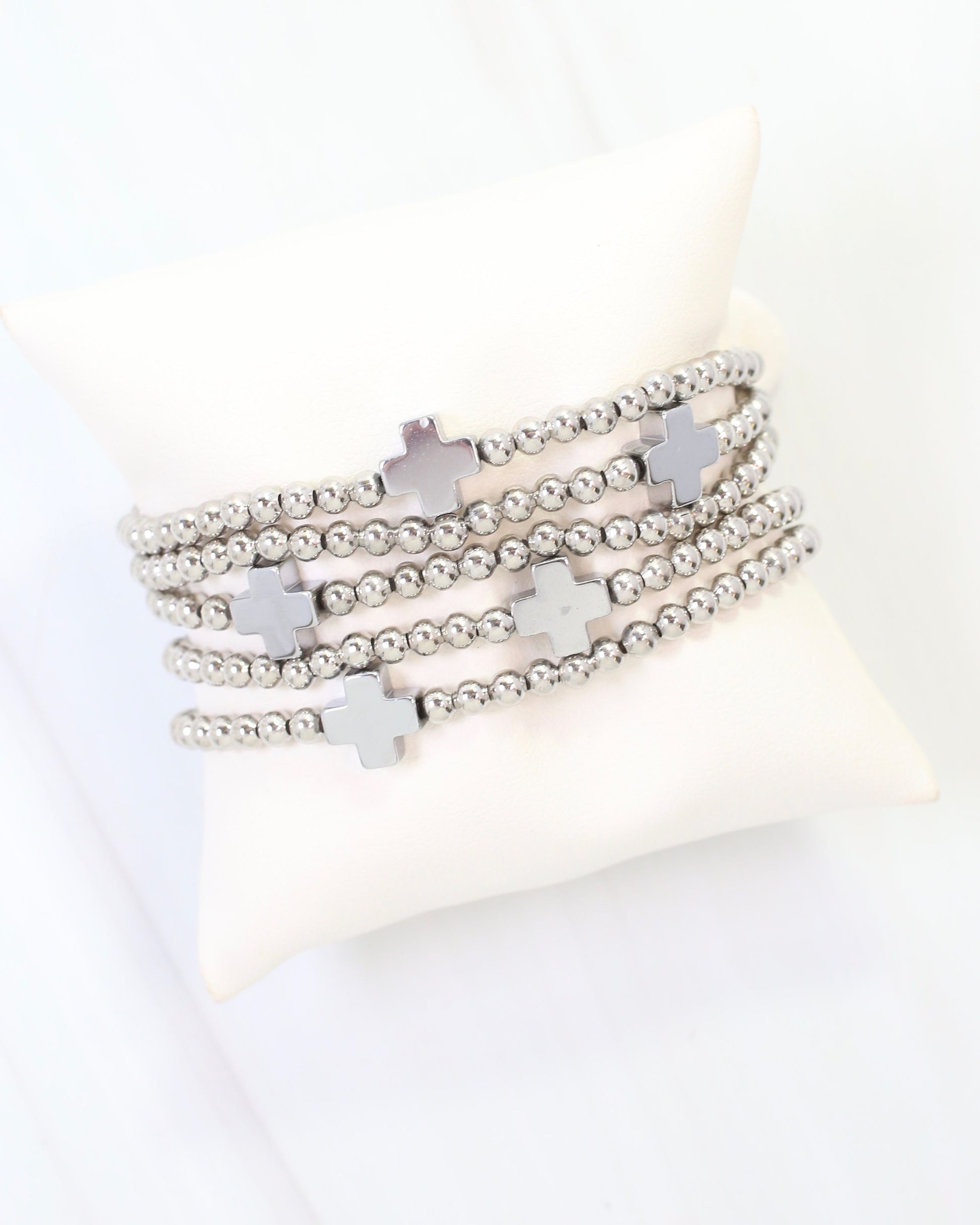 This beautiful and stylish bracelet set includes five identical strands. They are lined with metal beading and cross charms with a shiny finish. Together, they make a great stack but can also be worn with other bracelets as well. Stretches to fit most wrists.