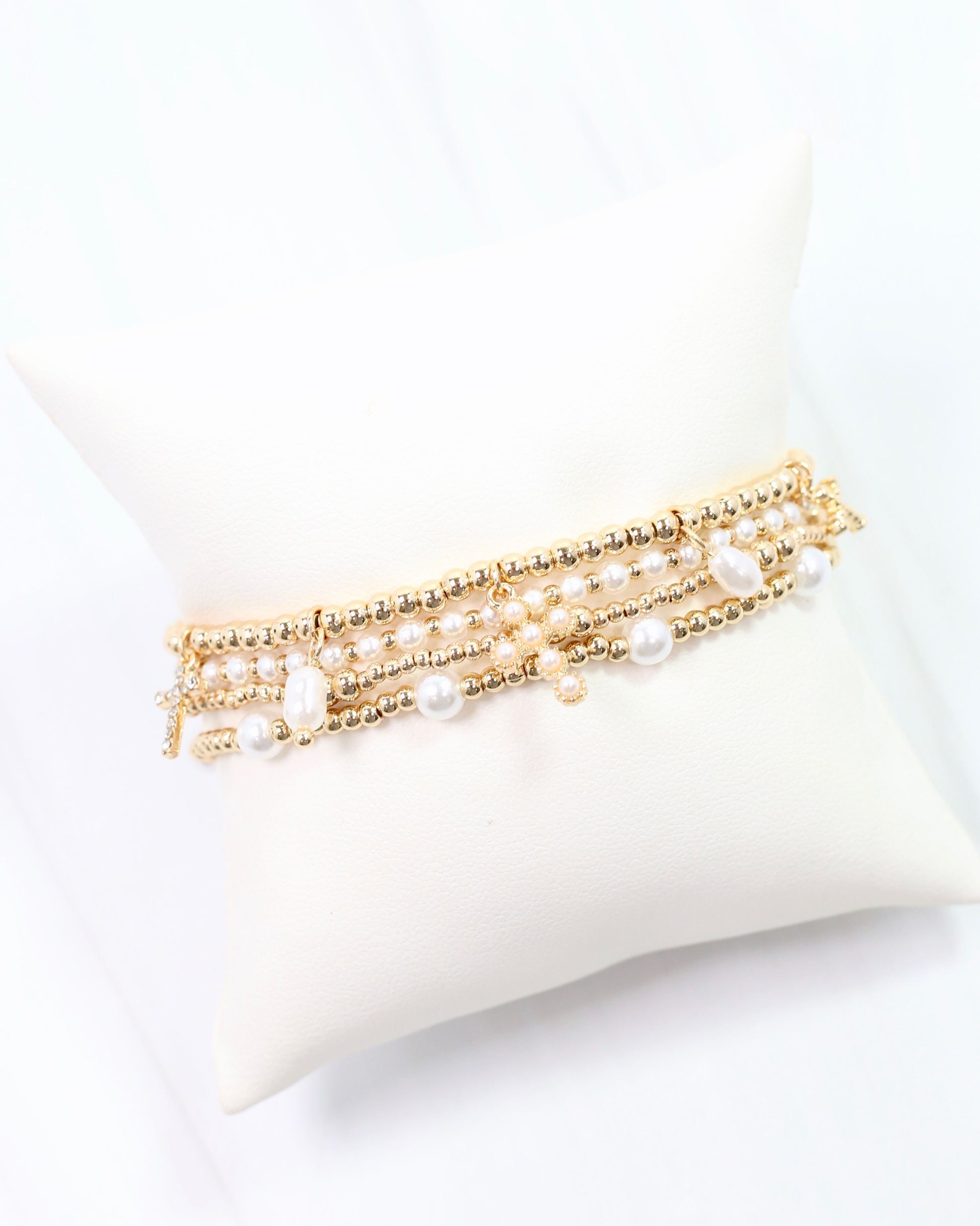The Olympia Pearl and Cross Stretch Bracelet Set in Gold features four unconnected strands: small gold beads, alternating gold and pearls, gold with dangling cross charms, and gold beads with pearl accents. Ideal for stacking or mixing with other bracelets, this set adds a stylish, layered touch to any look.