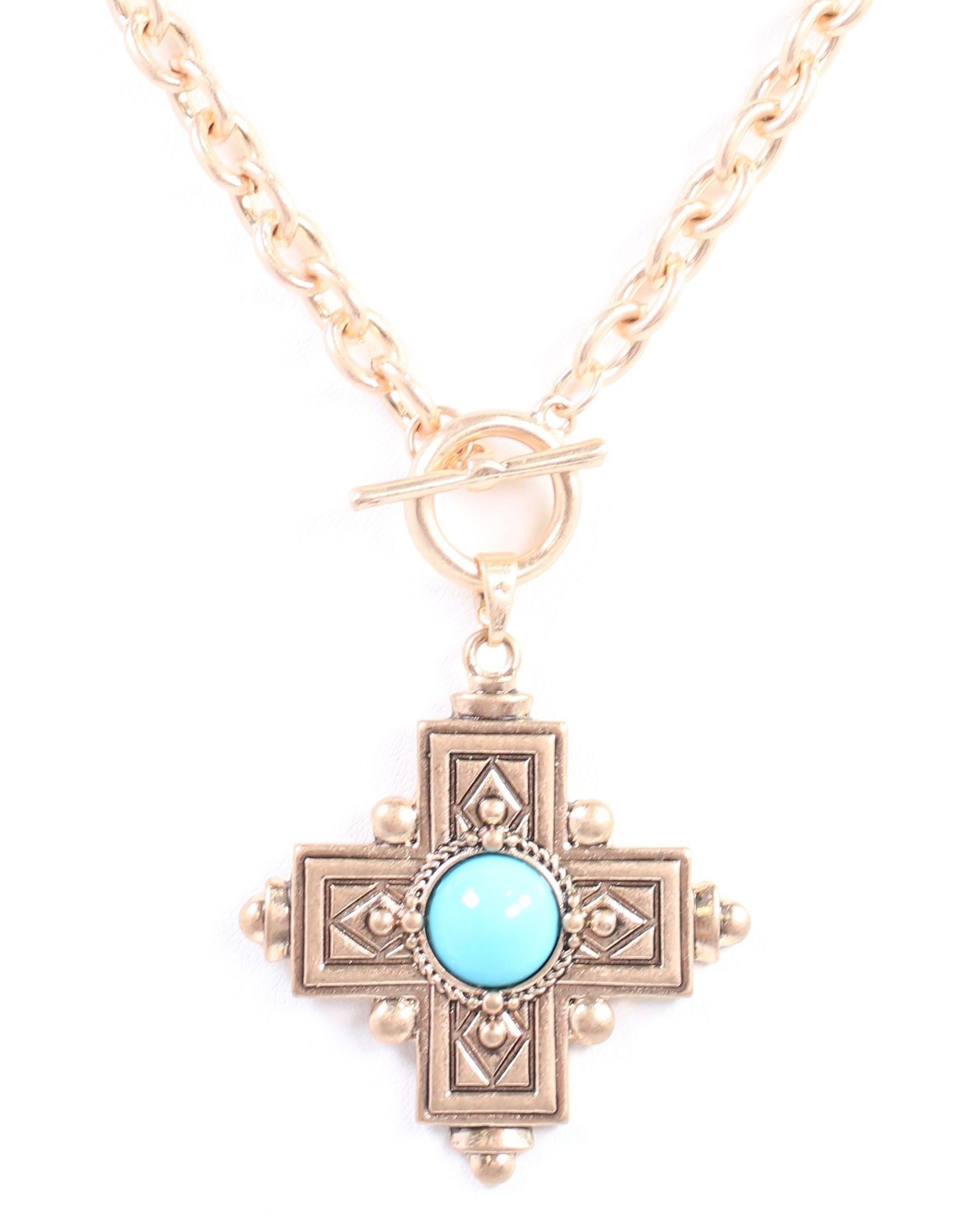 The Opelika Cross Pendant Necklace features a worn gold chain with an Aztec-style cross and a vibrant turquoise center. It includes a toggle and clasp with extender for adjustable wear, adding a stylish edge to any outfit.