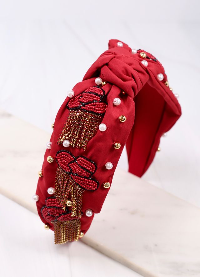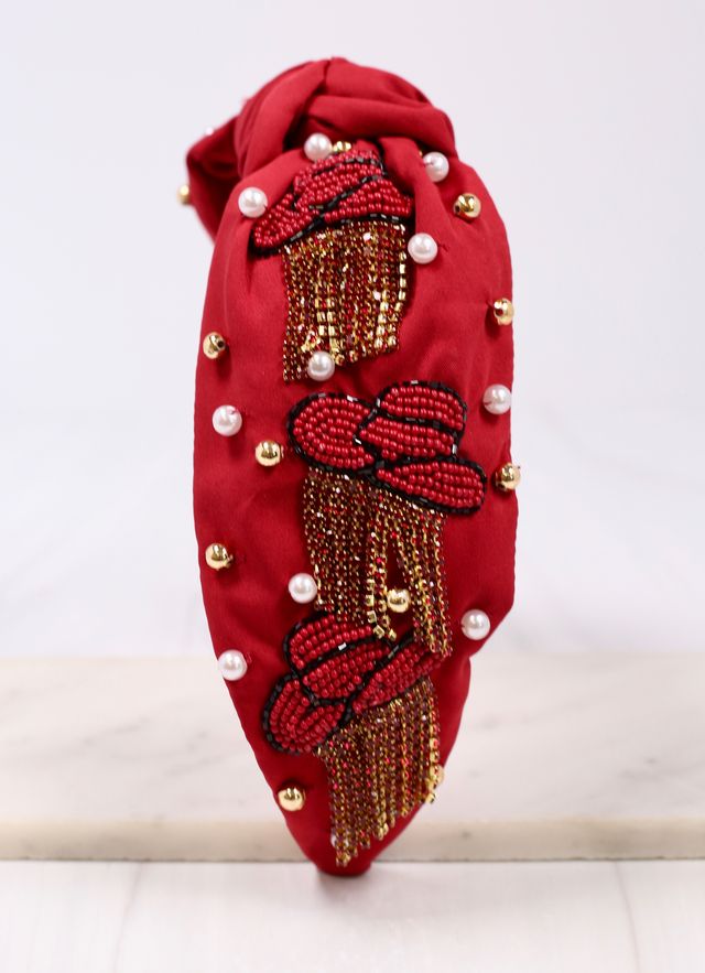 Yeehaw! This adorable fabric headband features beaded cowboy hats with rhinestone fringe! It is embellished with gold beading and pearls with a top knot accent as well.