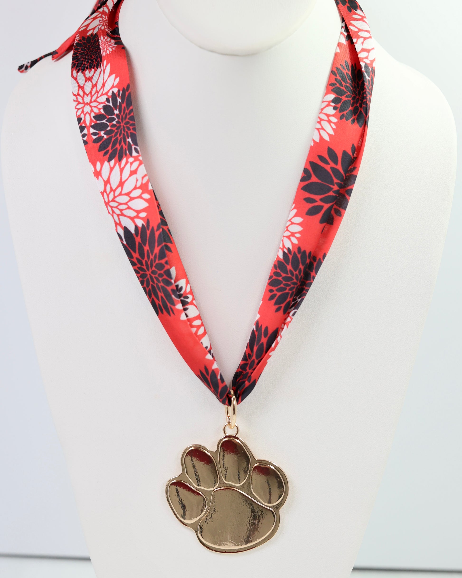 Add a splash of fun and flair to your style with the Paddy Paw Red and Black Floral Scarf Necklace. Its vibrant colors and charming design make it the perfect accessory to brighten up any outfit. Play mix and match by pairing it with other favorites—this scarf necklace is truly a must-have for creative fashion lovers!