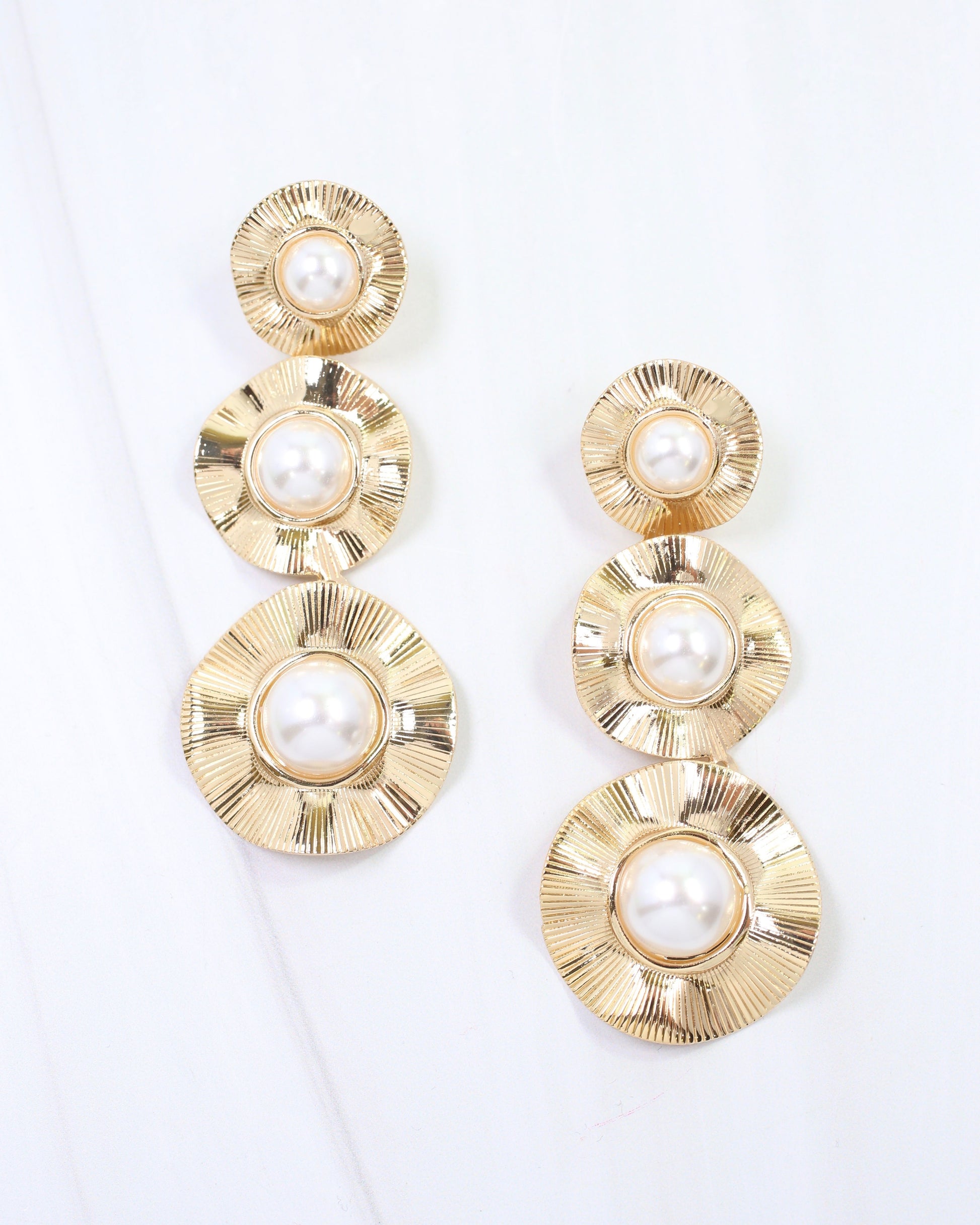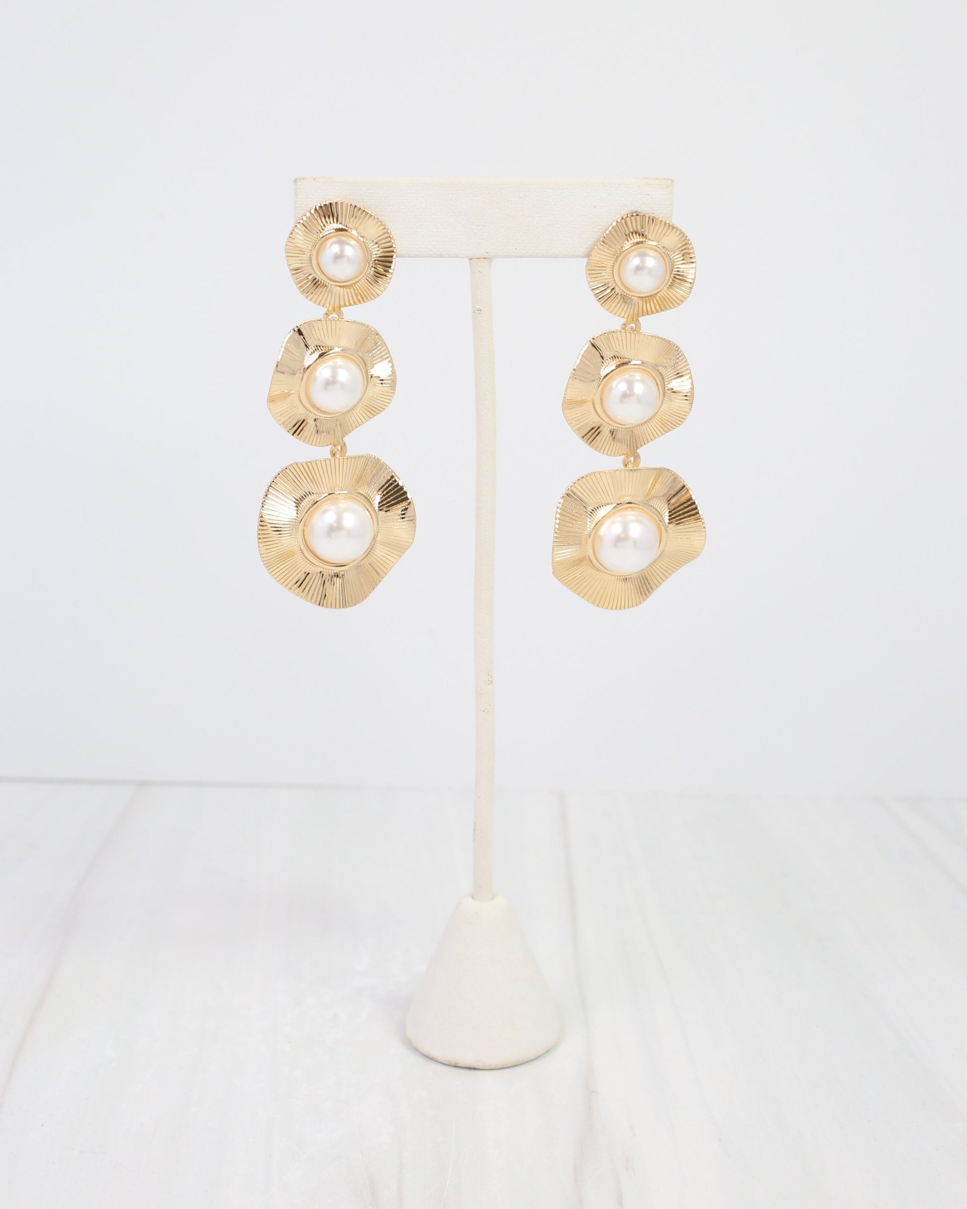 The Palermo Three Pearl Drop Earrings combine timeless elegance with luxurious gold settings. Three lustrous pearls cascade gracefully from each earring, creating sophisticated movement. Perfect for adding refined polish to any occasion.