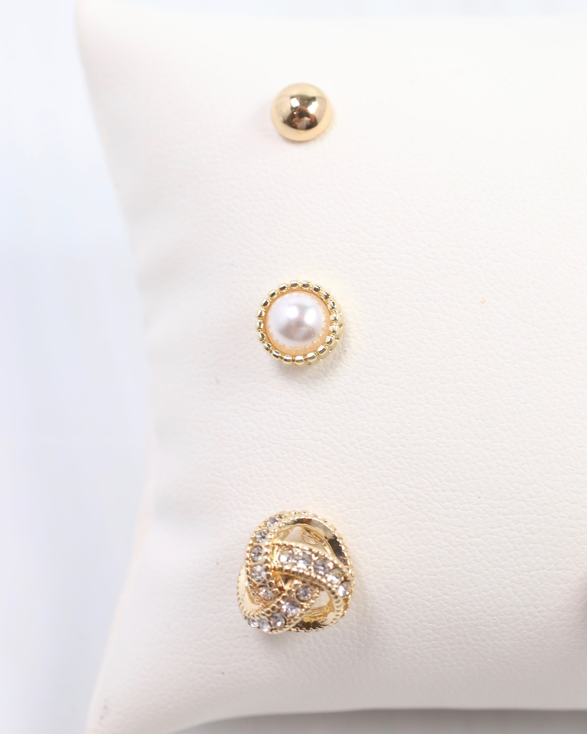 Add a touch of sparkle and charm to any outfit with the Parker Earring Set in Gold. This playful trio features three pairs of studs: a classic gold ball, a pearl stud edged in gleaming gold, and a dazzling gold knot encrusted with CZ stones. Perfect for mixing and matching, this set lets you switch up your look effortlessly every day.
