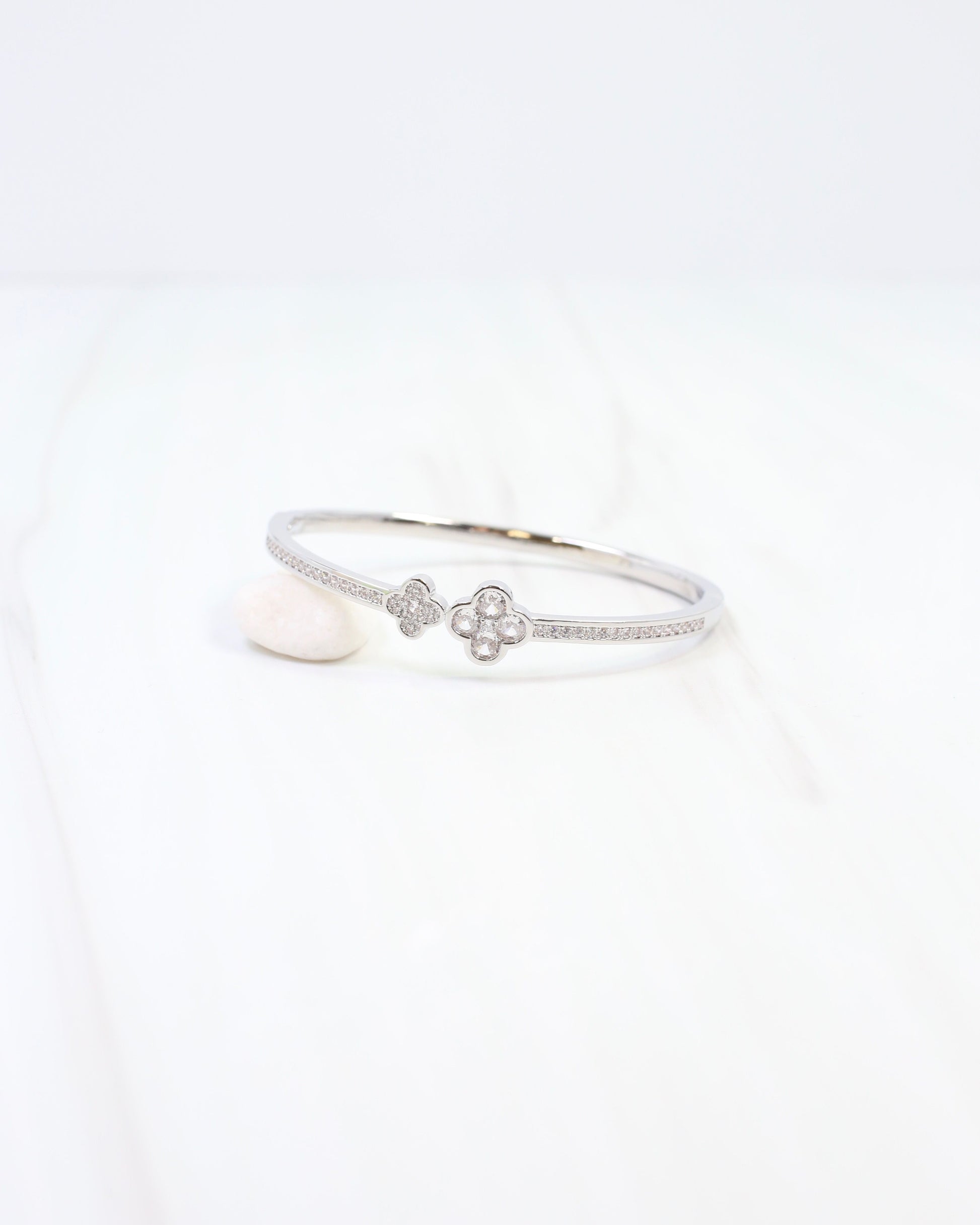 Elegant white rhodium silver bracelet featuring a delicate clover design with sparkling cubic zirconia accents. Secure hinge closure and timeless polish make it perfect for any occasion.