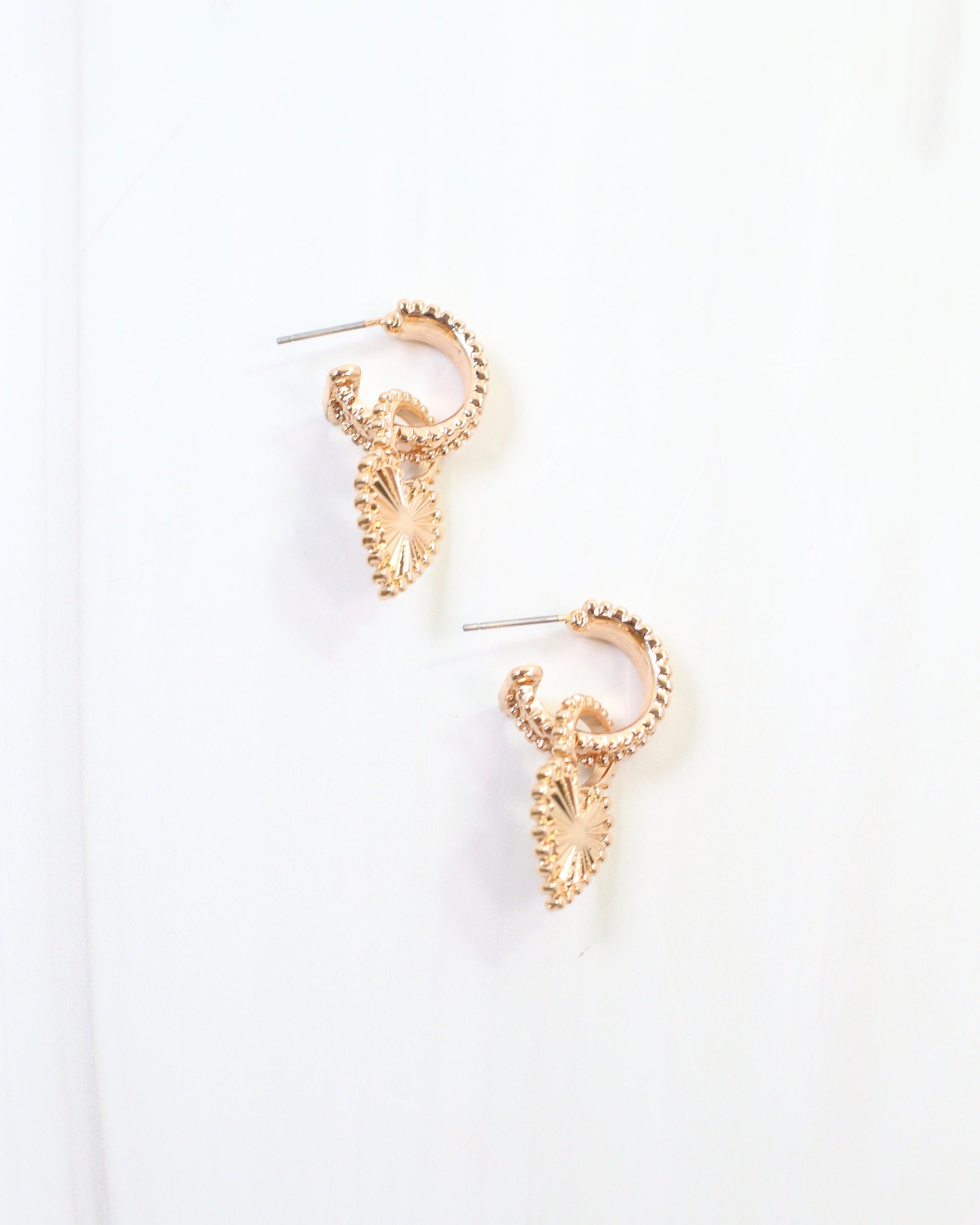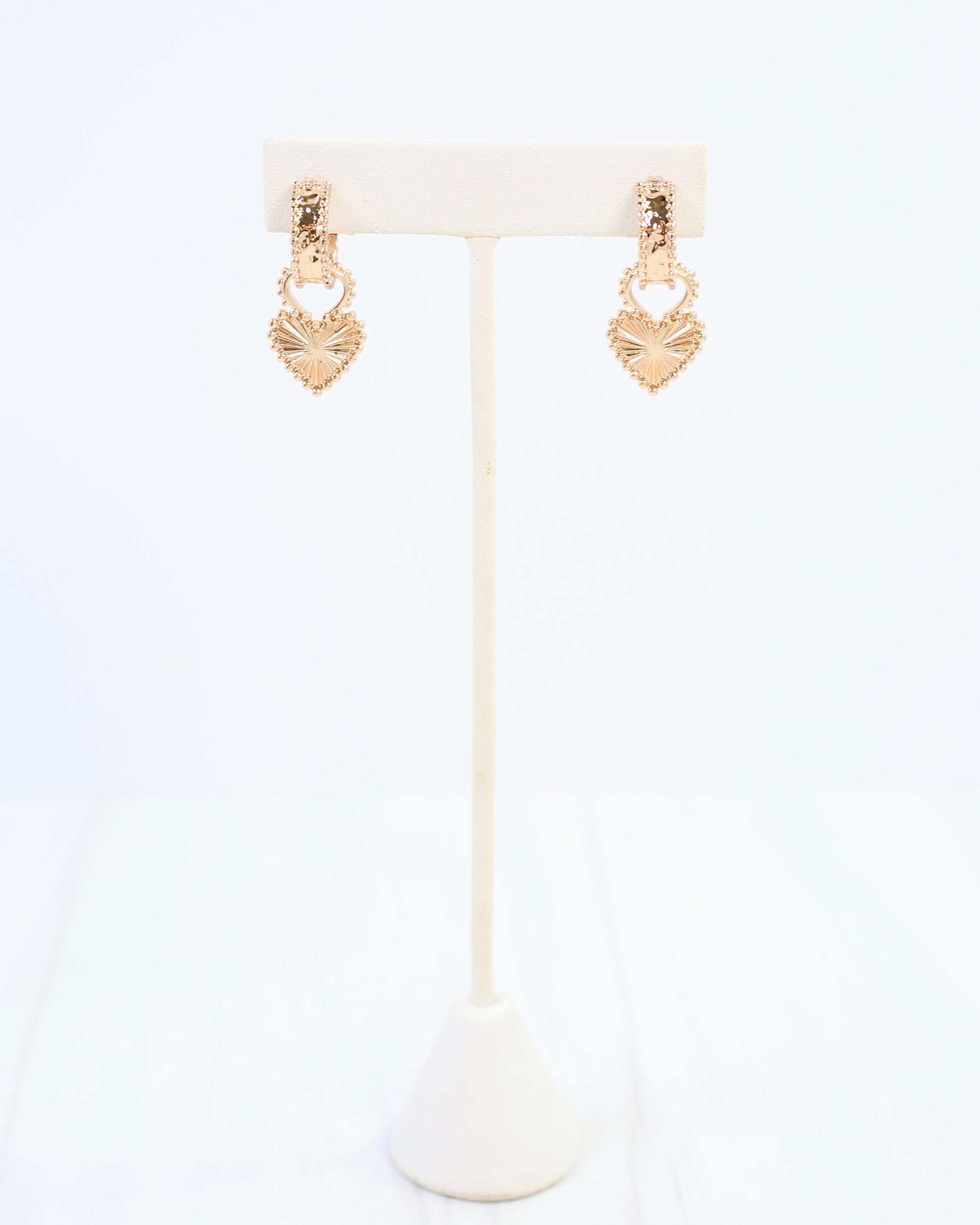 Add a touch of elegance to your look with the Paulson Heart Hoop Earring in gold. This fashionable piece features a gold hoop accented by a charming dangle heart, detailed with ribbed texture and a delicate dotted design along its outer edge. Perfect for adding subtle sophistication to any outfit.