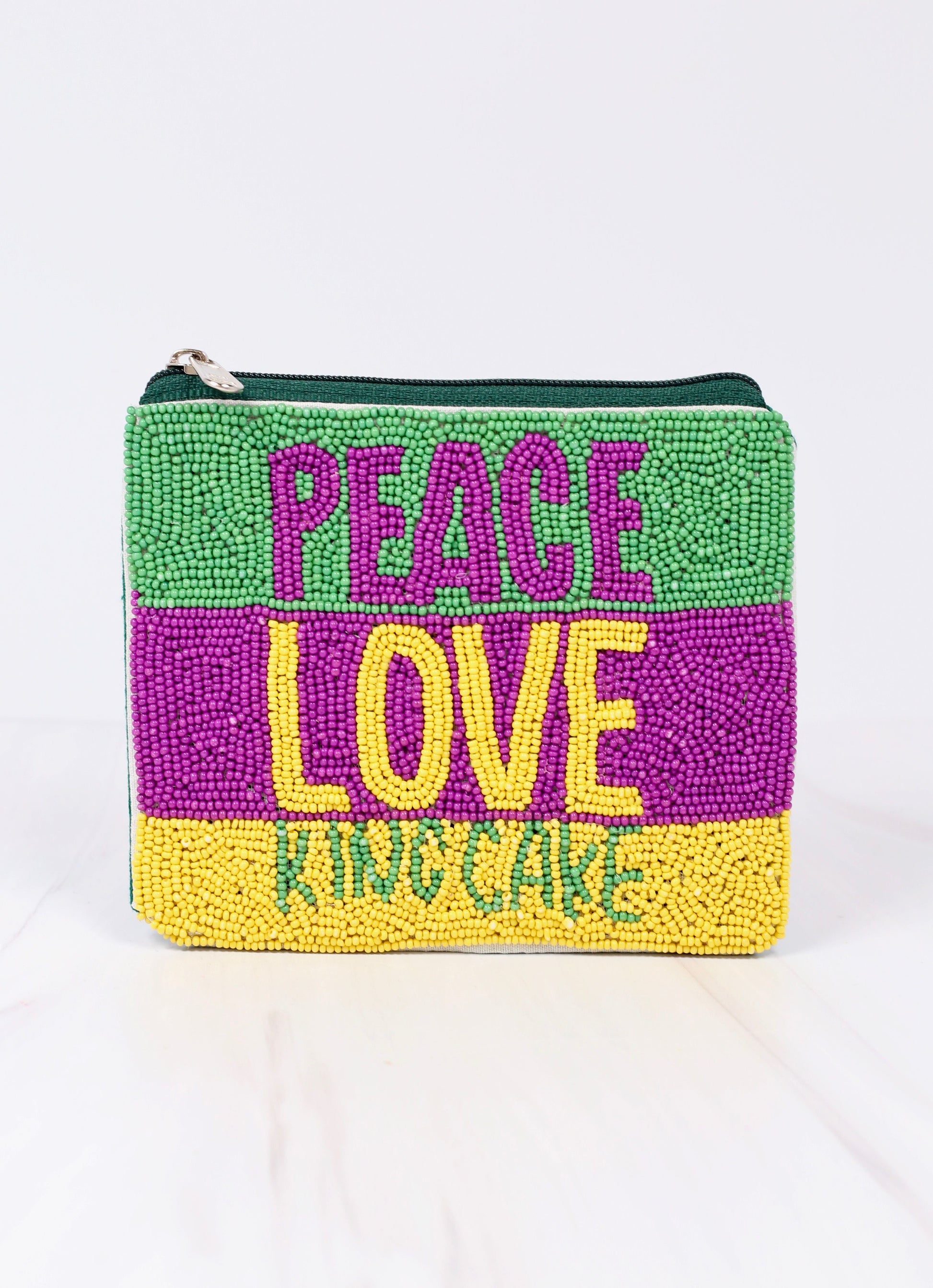 Be Mardi Gras ready with this beaded pouch! It says "Peace Love King Cake" in traditional Mardi Gras colors.