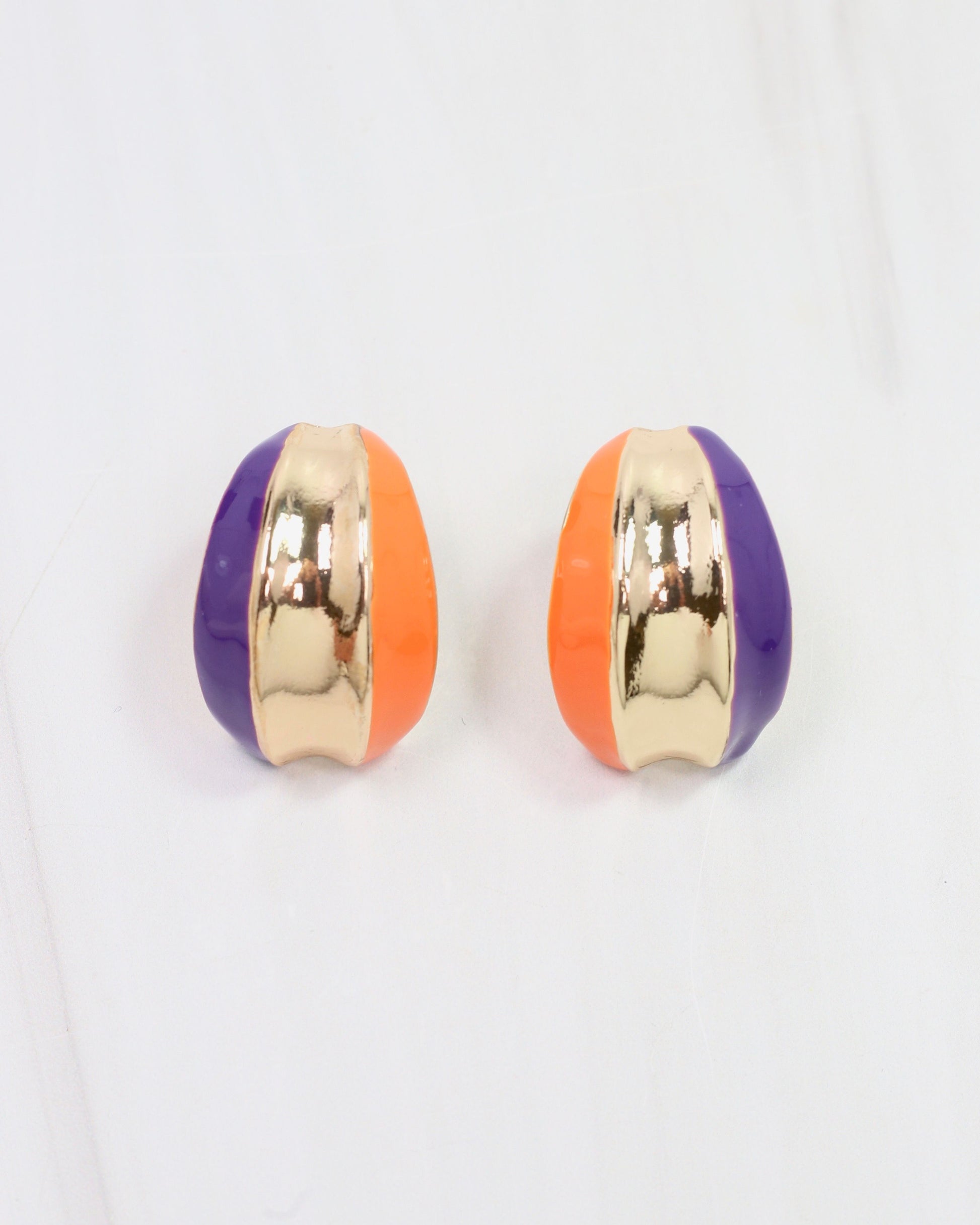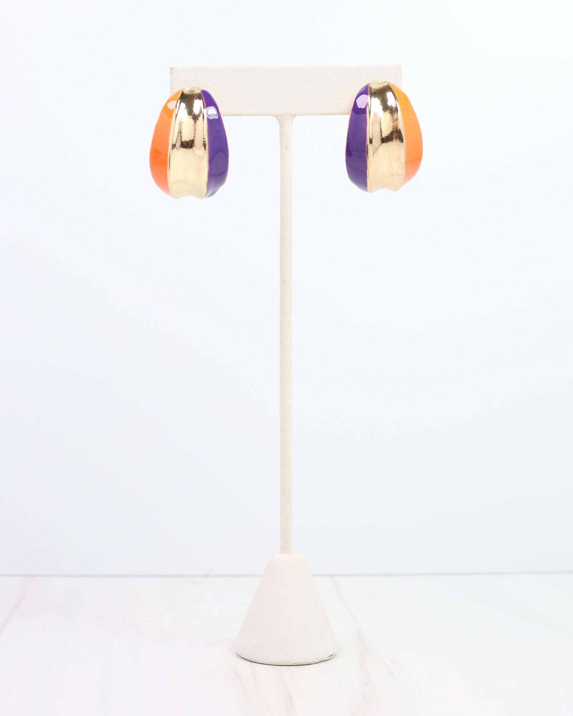 Add a pop of team spirit to your look with the Penney Hoop Earrings in Orange and Purple. These wide semi-hoops feature vibrant enamel colors on both sides, framed by a shiny gold center for a touch of glam. Perfect for showing off your pride with a playful twist!