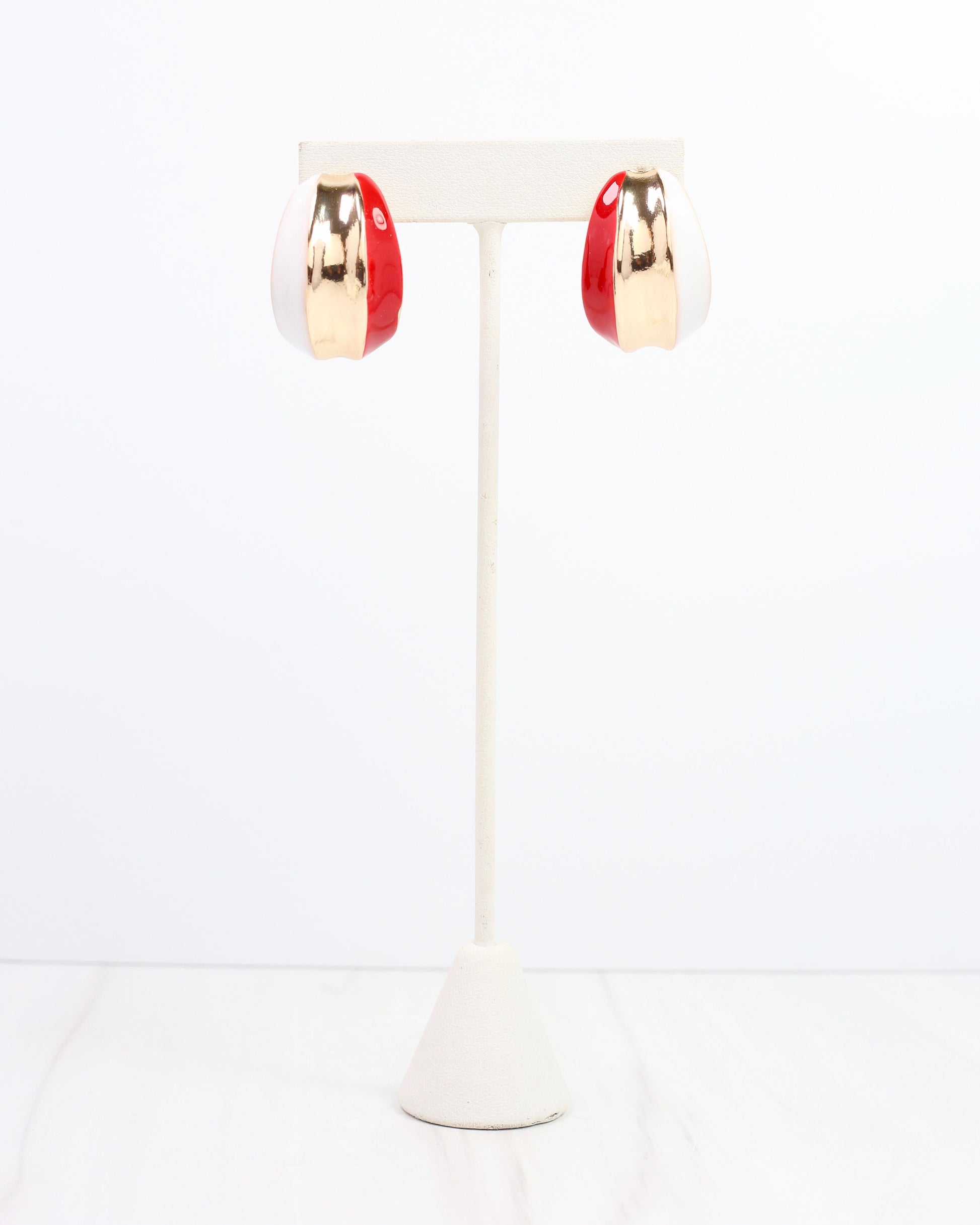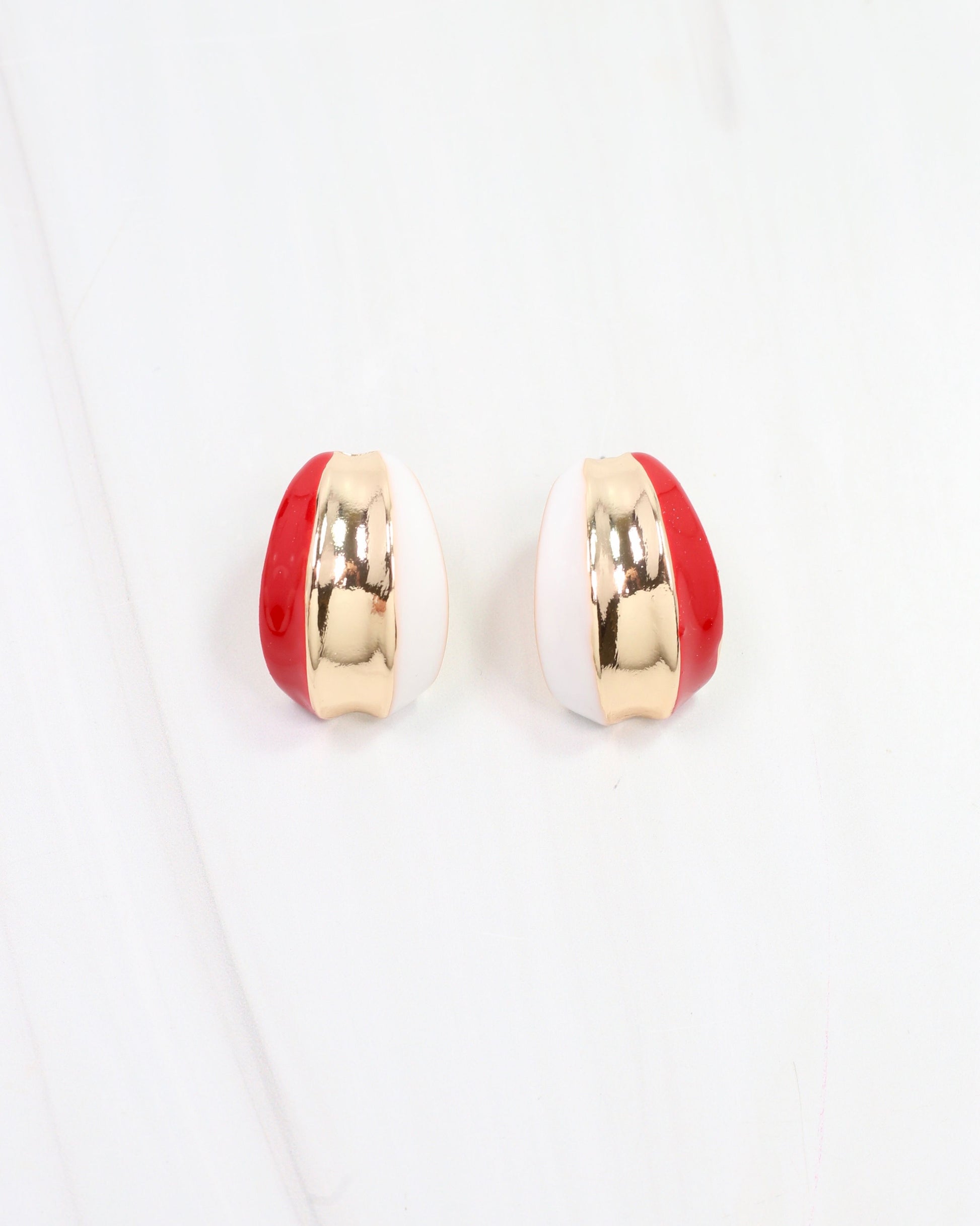 Add a pop of team spirit to your look with the Penney Hoop Earrings in Red and White. These wide semi-hoops feature vibrant enamel colors on both sides, framed by a shiny gold center for a touch of glam. Perfect for showing off your pride with a playful twist!