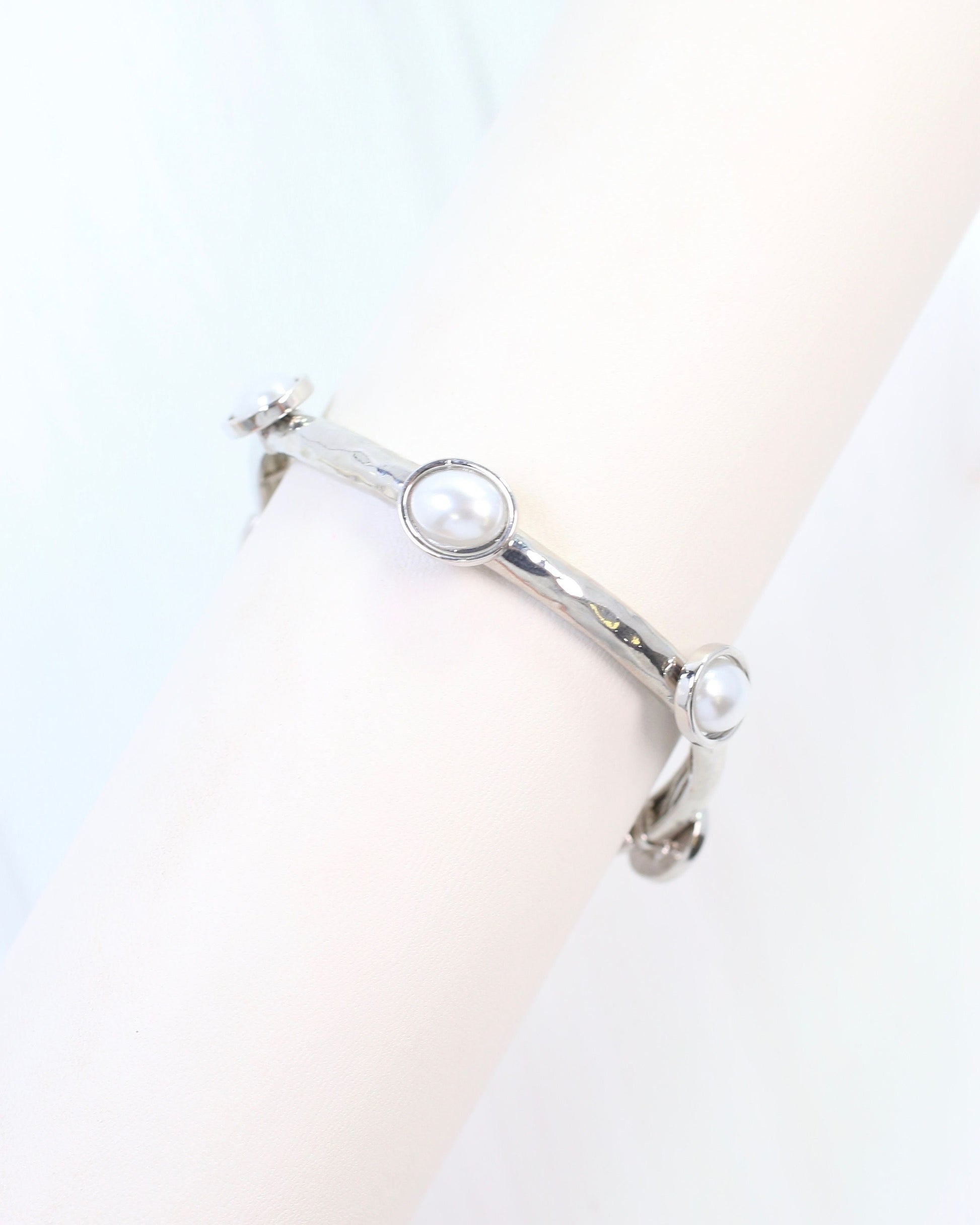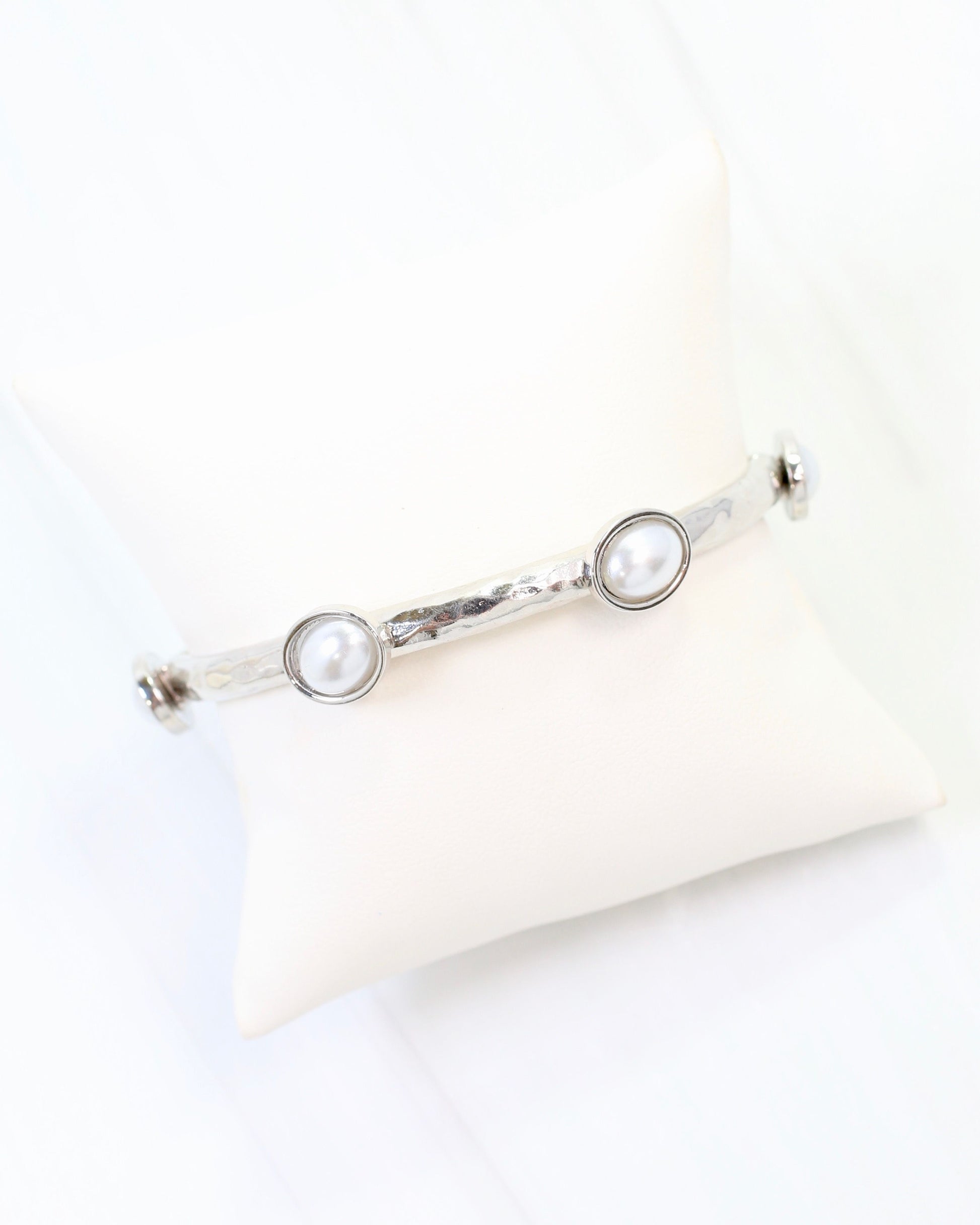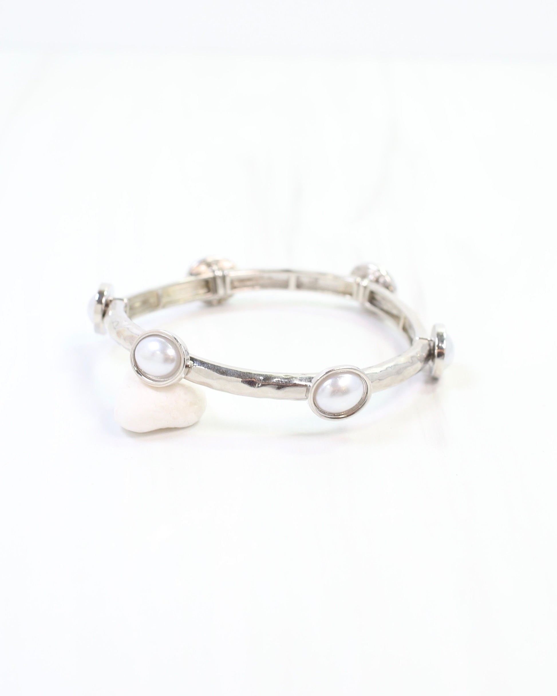 This metal bracelet has a shiny, hammered design and is accented with oval pearls. It's a great thinness and stretches to fit most wrists
