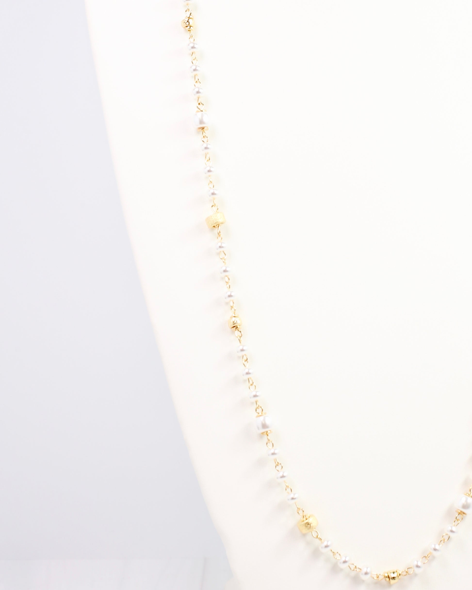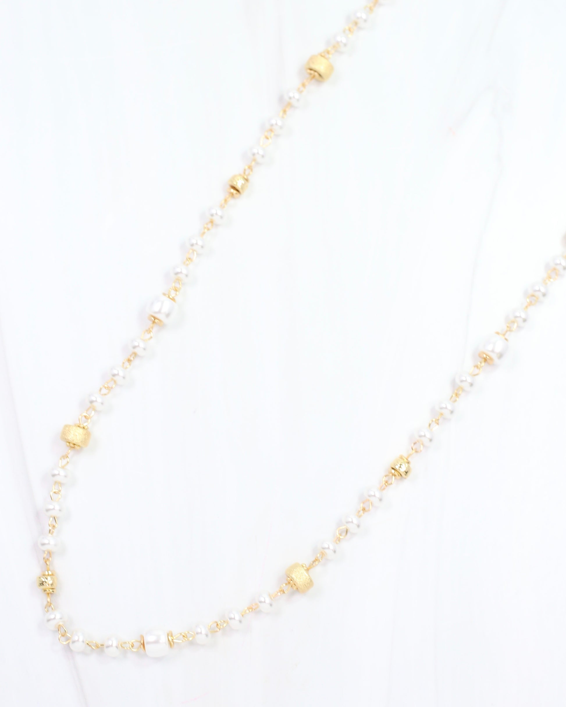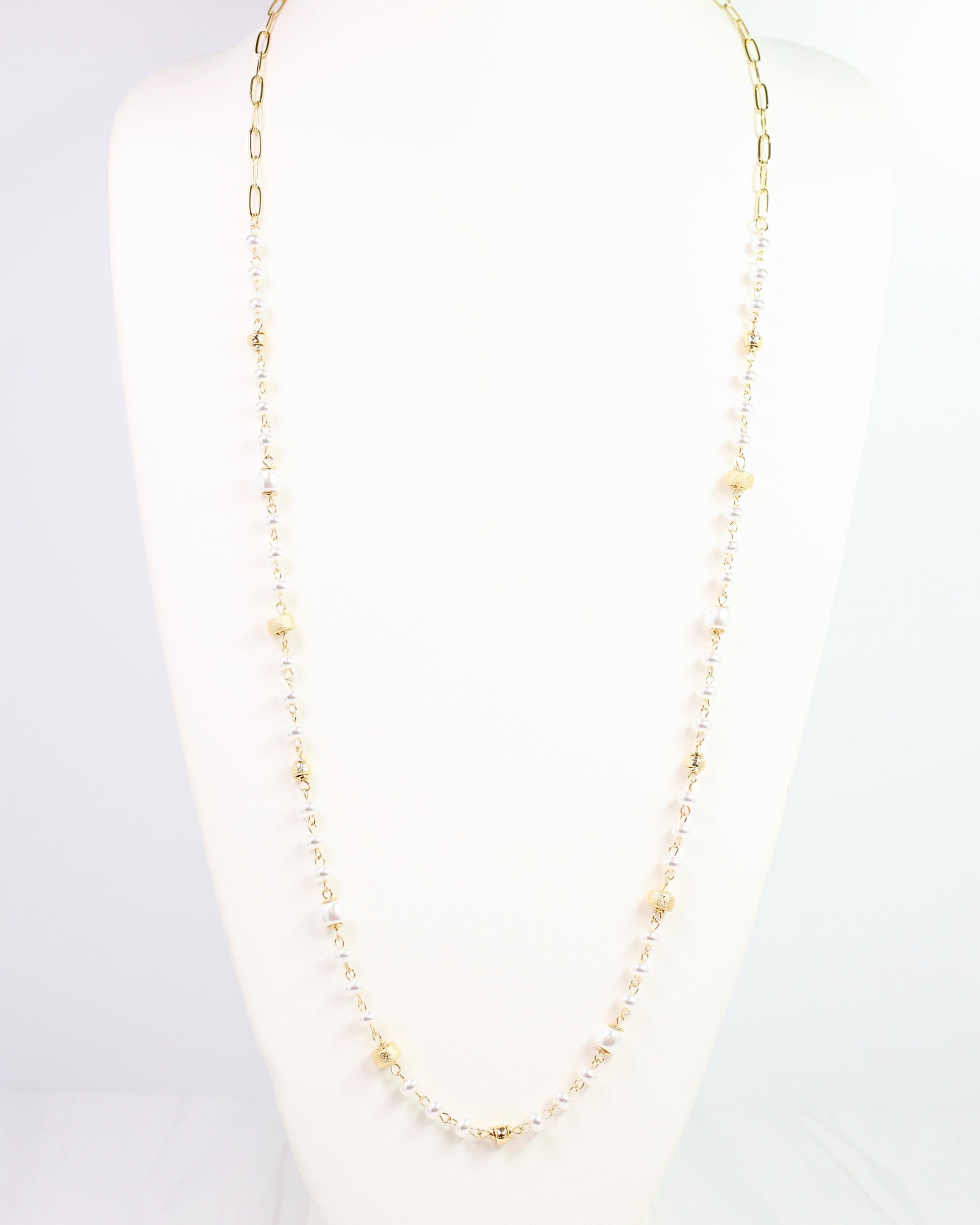 The Piper Pearl Long Necklace in Gold combines pearls and gold accents for a versatile, elegant look that enhances any outfit.