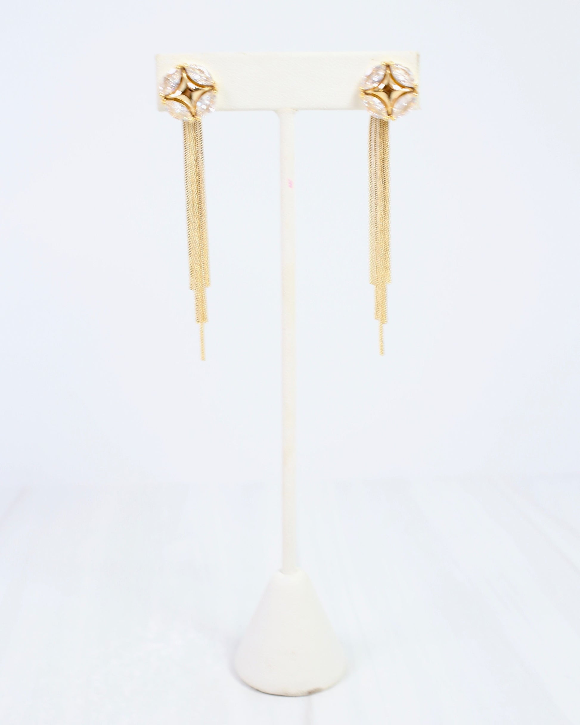 Elevate your style with the Presley Crystal and Fringe Drop Earring in Gold. This versatile piece features a sparkling crystal stud paired with a chic fringed back, adding movement and a modern edge to any outfit. Wear the stud alone for a subtle sparkle or pair it with the fringe for a bold, fashionable statement. Perfect for day-to-night looks, these earrings bring effortless glamour to your jewelry collection.