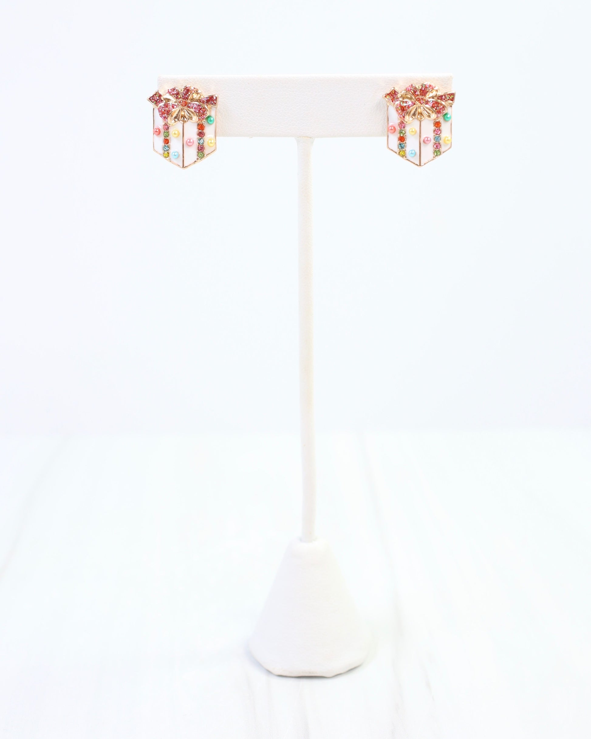 The Pretty Present Stud Earrings in White combine multicolored stones and pearls for a stylish, elegant look. Perfect for adding a fashionable touch to any outfit.