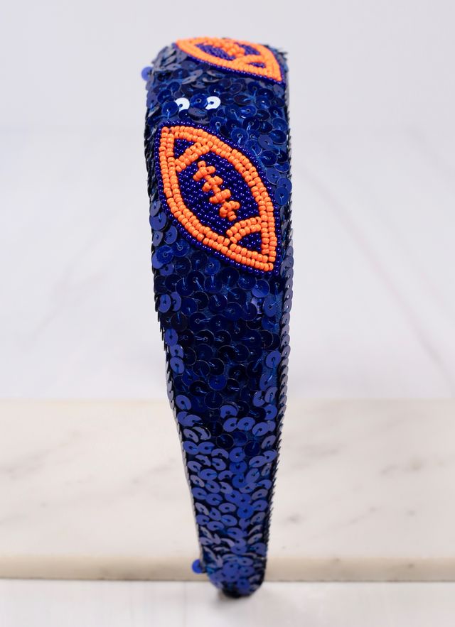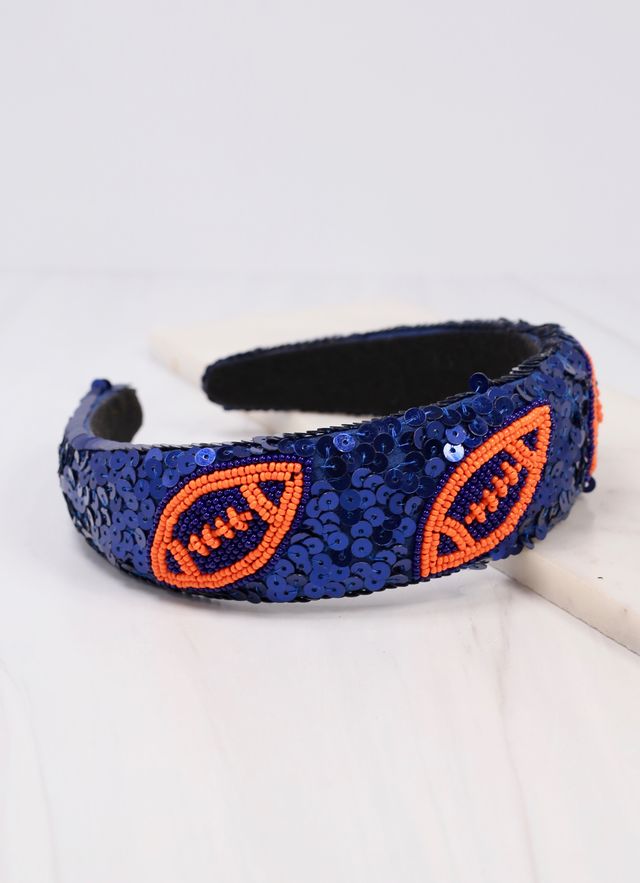 This sequin covered headband has accent beaded footballs in a two tone color design. Pair with your game day outfit to the big game or tailgate for an eye-catching look!
