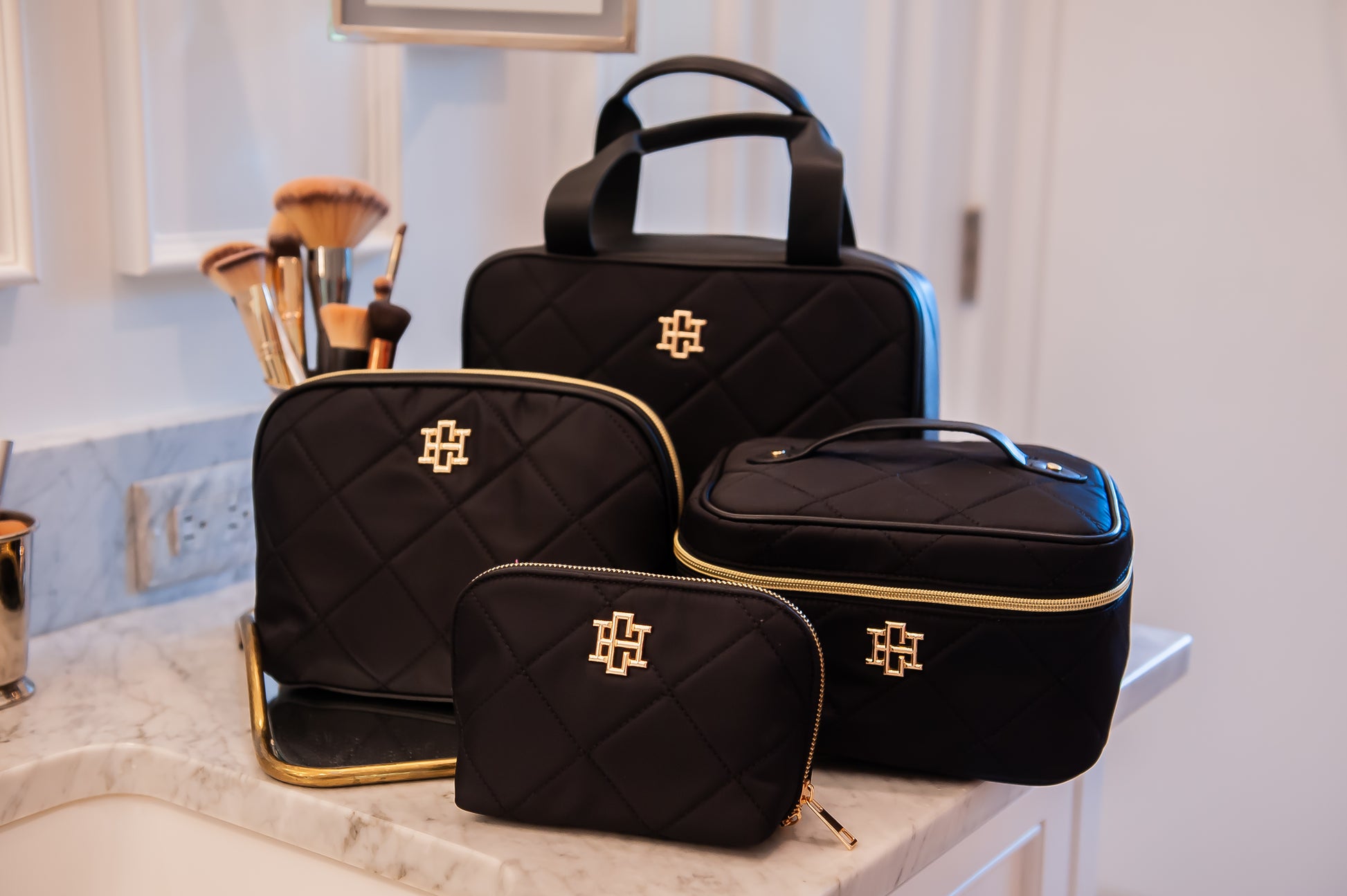 This large case is the ultimate makeup and travel piece. It features a quilted nylon fabric and two top carrying handles. The three sided zipper allows the case to unfold and lay completely flat, and the interior is lined with a hot pink fabric with a clear protective material. For ultimate organization, this case has four clear removable pouches that are attached to the interior with velcro. Each removable case has a zipper closure. The possibilities are endless when it comes to what this case can carry- cosmetics, toiletries, chargers, and more.