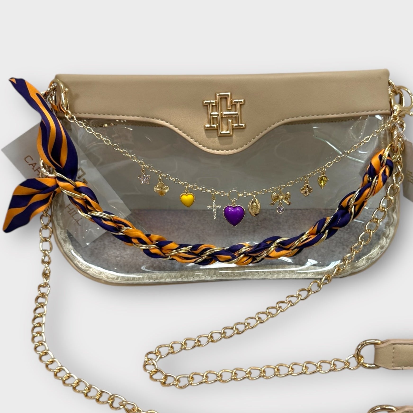 Elevate your game day look with the Purple Gold Clear Bag Bundle. The Bag styled with the chain and scarf was hand picked by our owner, Jill. This playful combo layers the sleek Avery Bag chain with the chic Serafina Scarf Chain, creating a stylish and functional accessory. Perfect for carrying essentials while showing off your spirited style with a touch of fun flair.
