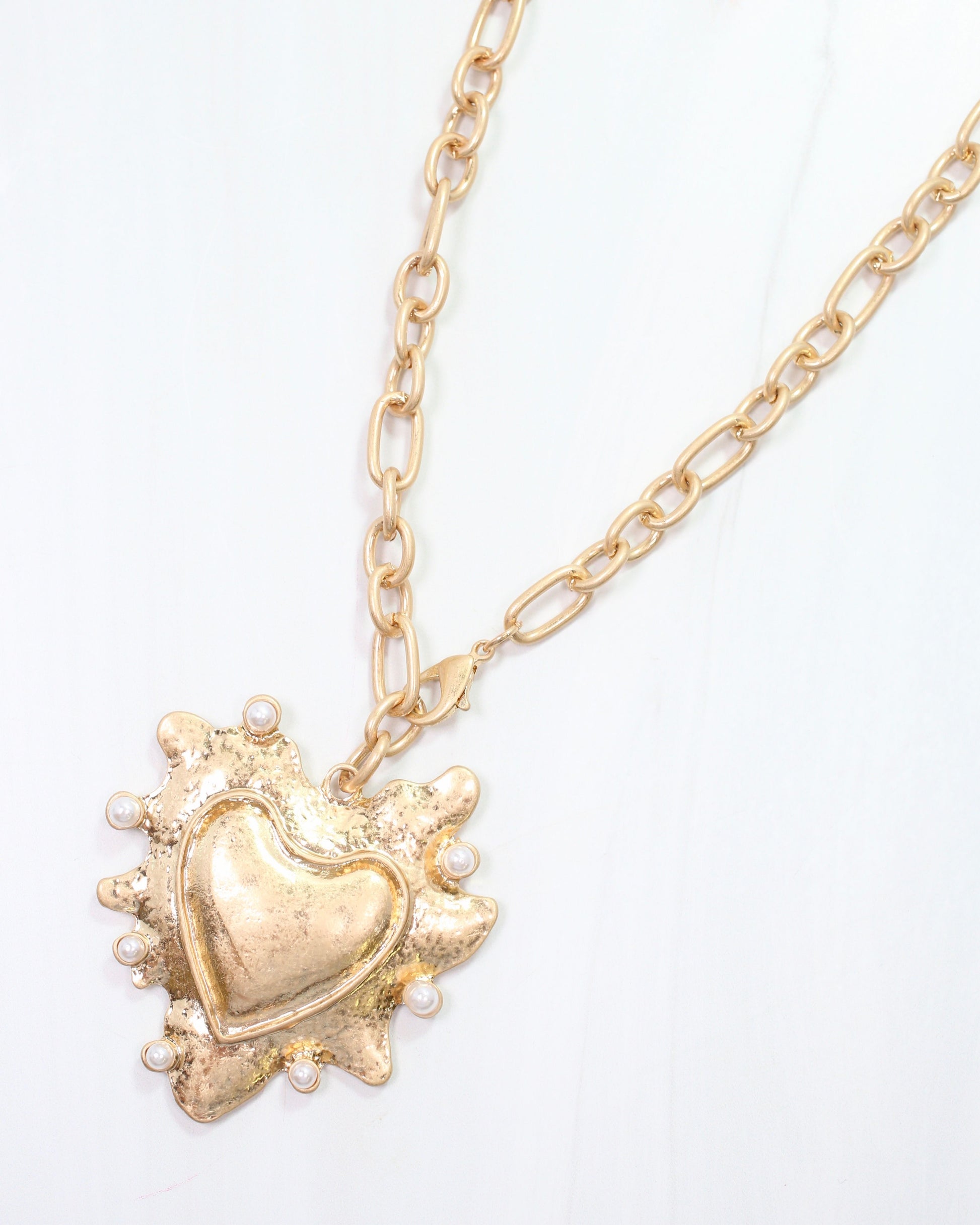 Add some heart and soul to your look with the Raina Long pendant Necklace in worn gold. The eclectic heart pendant features delicate pearl accents, while the long chain can be doubled for a shorter, more versatile look. Perfect for charming your way through any occasion.