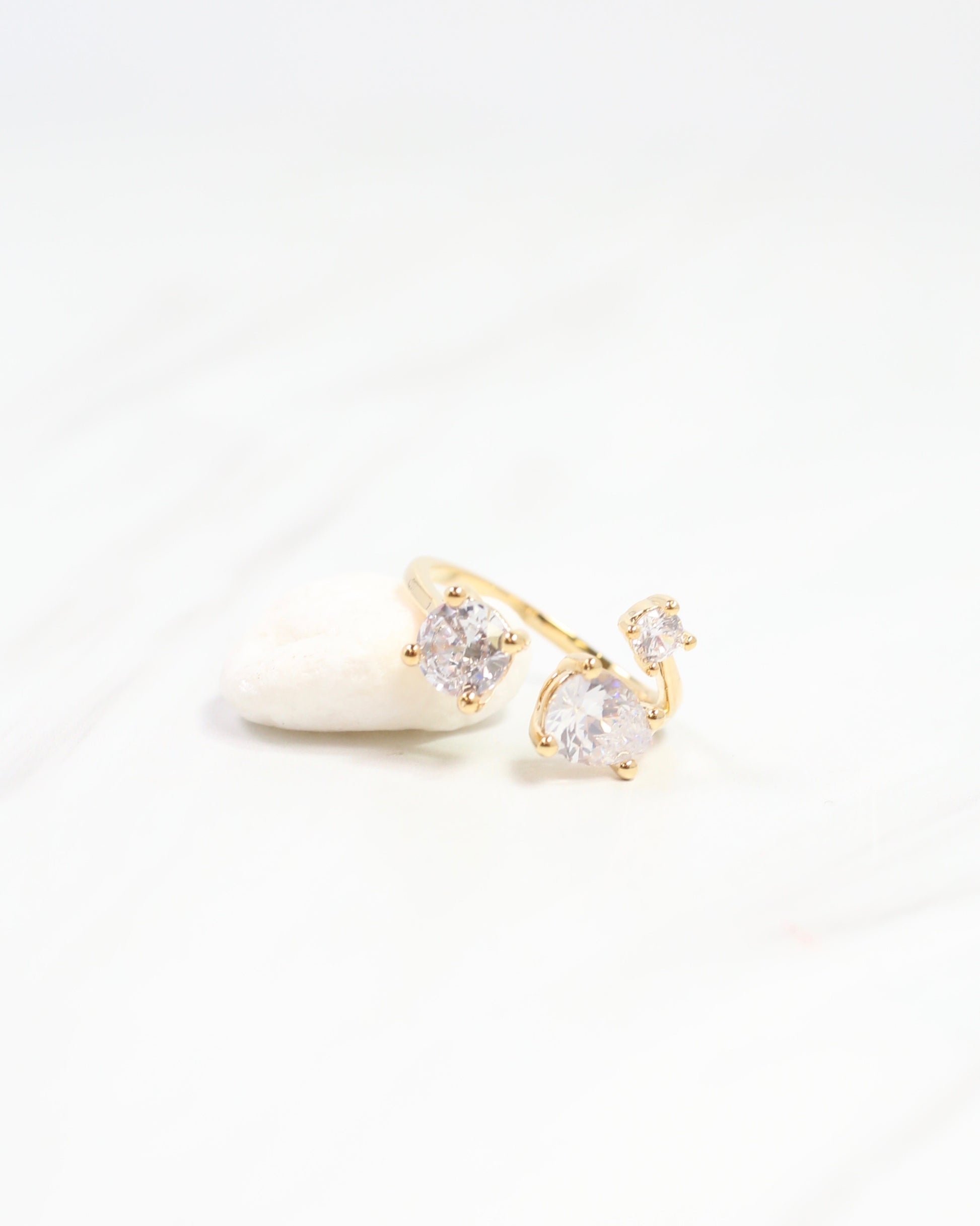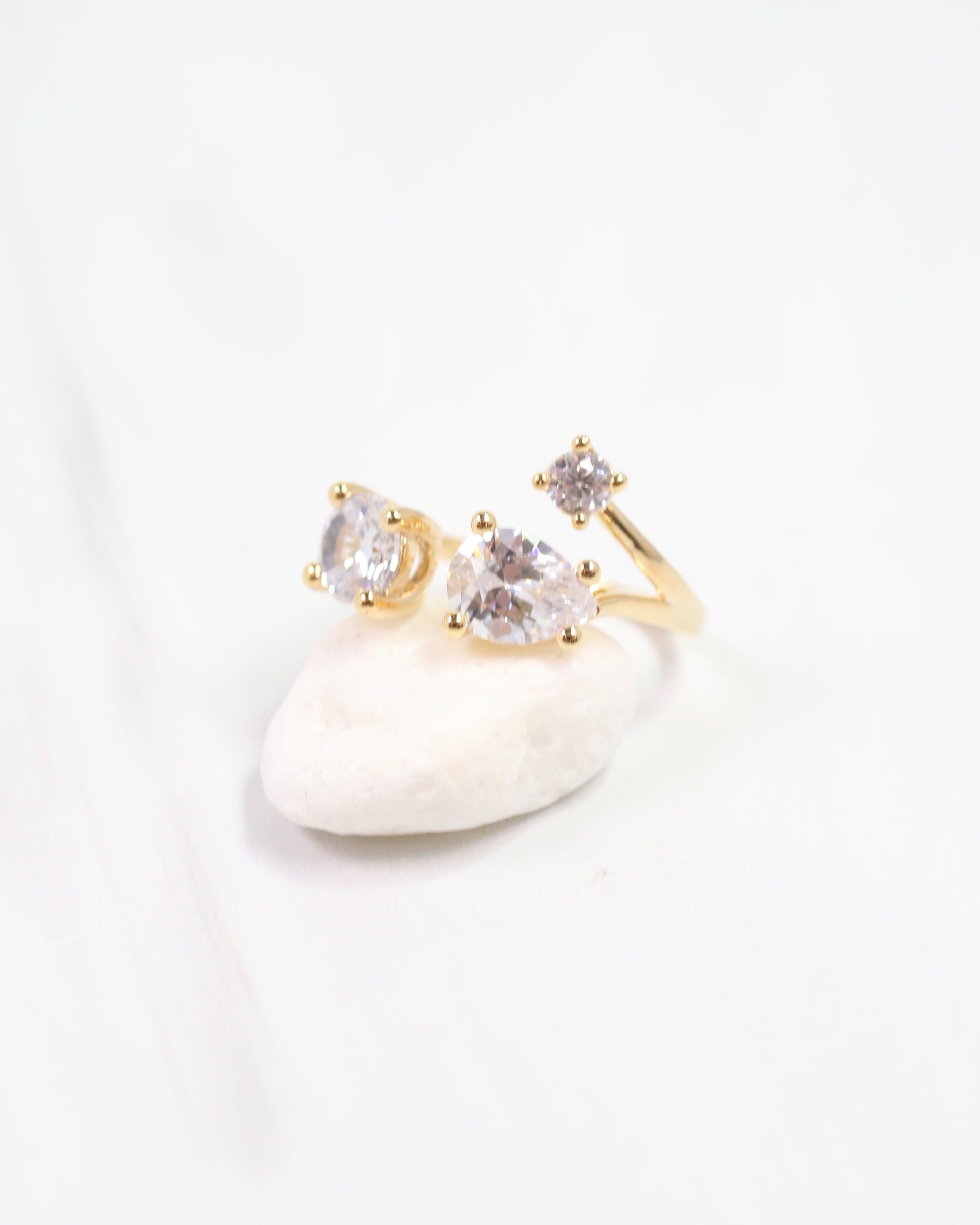 Make a bold impression with the Randi Crystal Ring Gold! This adjustable, gold-dipped brass statement ring features an open design showcasing a mix of shapes: a round stone, a pear-shaped stone, and a small square cz stone. Its playful blend of crystals adds flair and fun, making it the perfect accessory to brighten up any look.