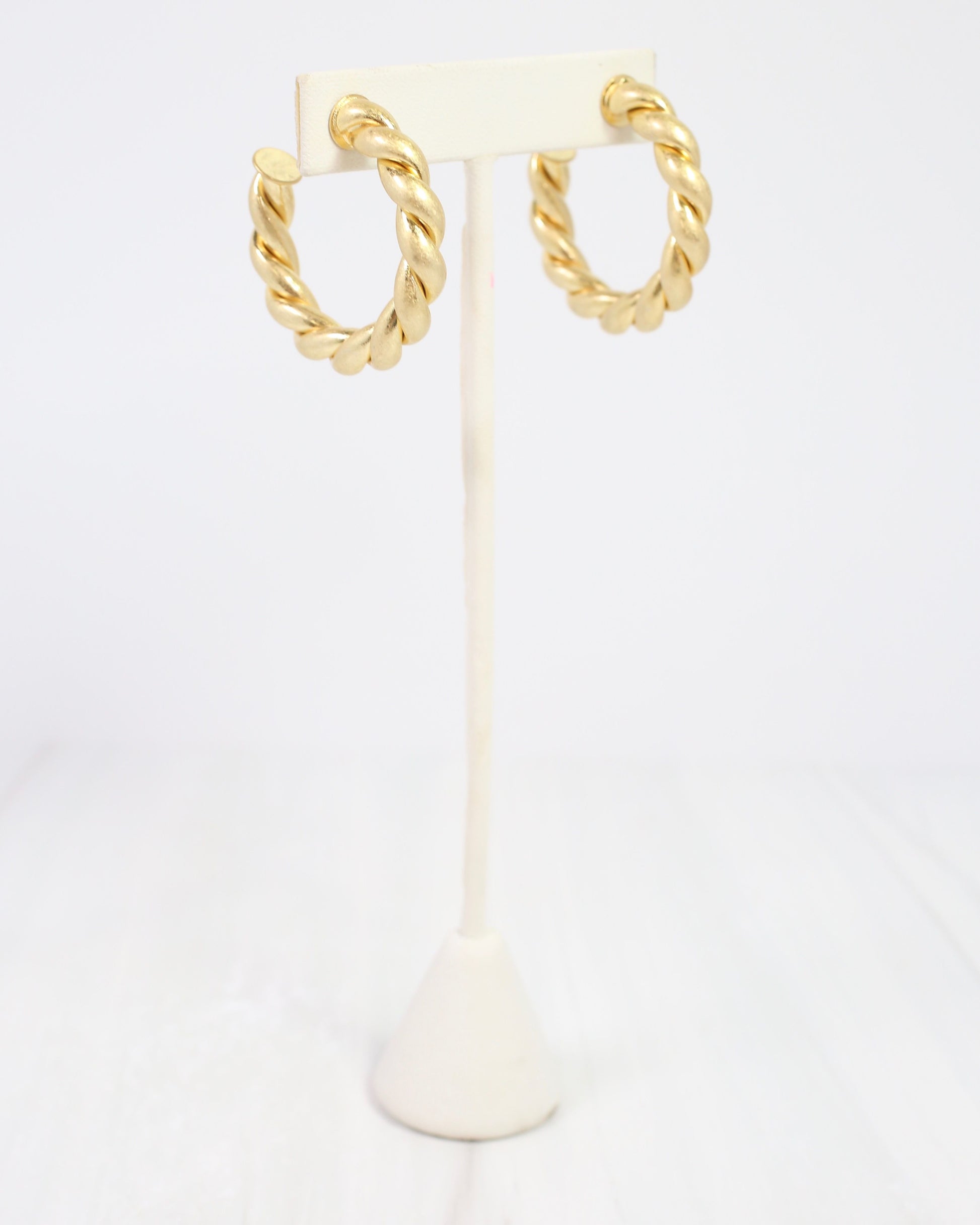 Elevate your style with the Raylee Twisted Hoop in Matte Gold. These lightweight hoops feature a beautiful twisted design, expertly gold-dipped for a luminous finish. Their classic yet fashionable look makes them perfect for any occasion, adding a subtle touch of elegance to your everyday wardrobe.