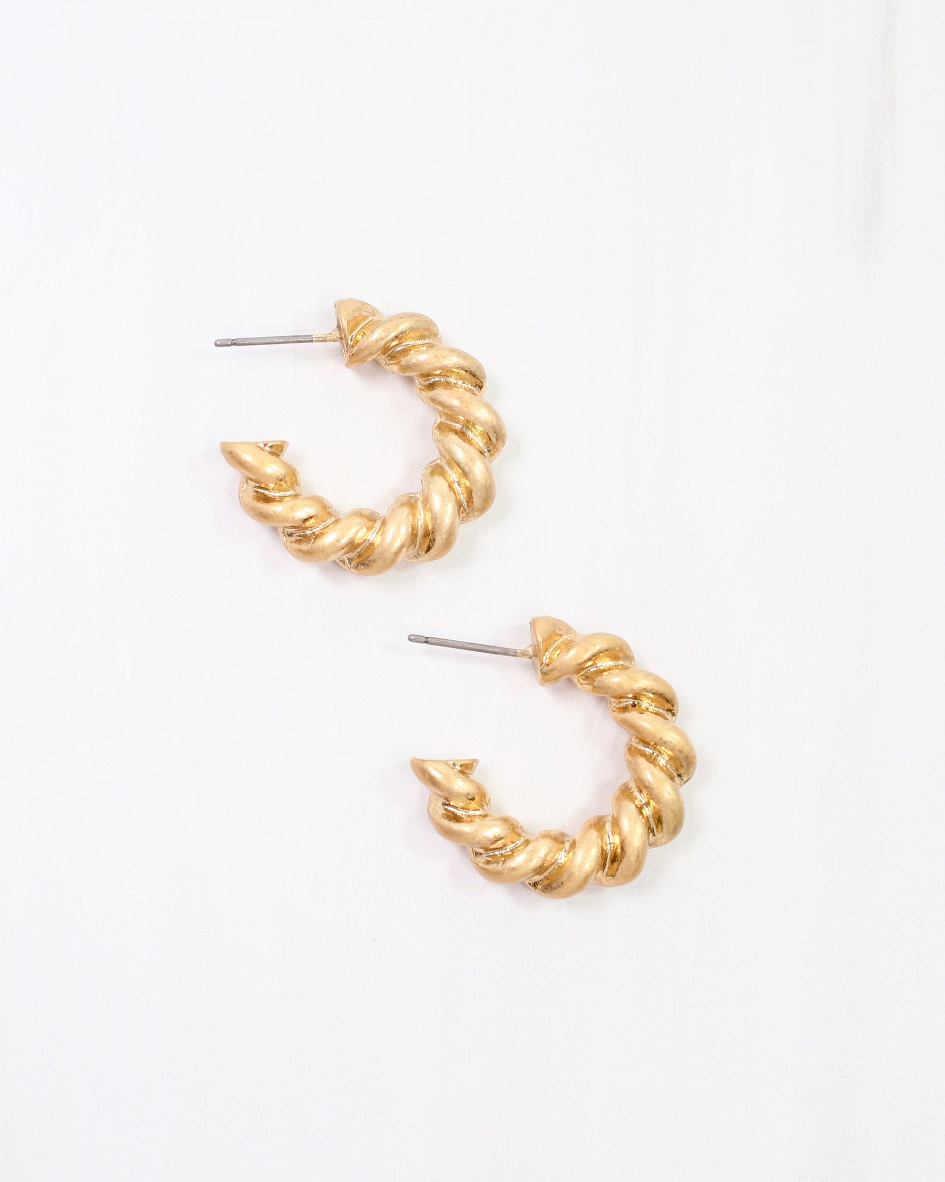 The Raymonde Small Twisted Hoop Earring in Worn Gold features a stylish twisted design and a comfortable titanium post for a chic, lightweight wear.