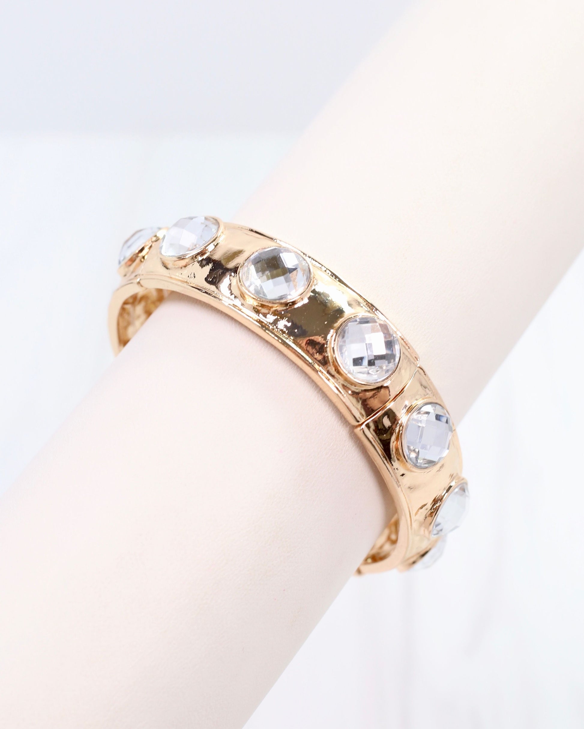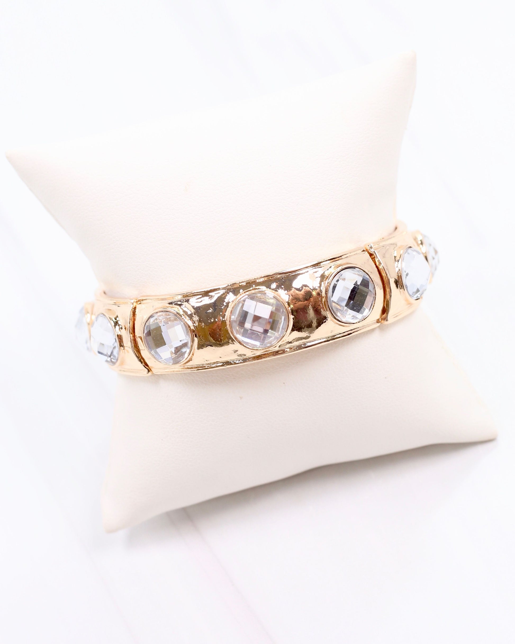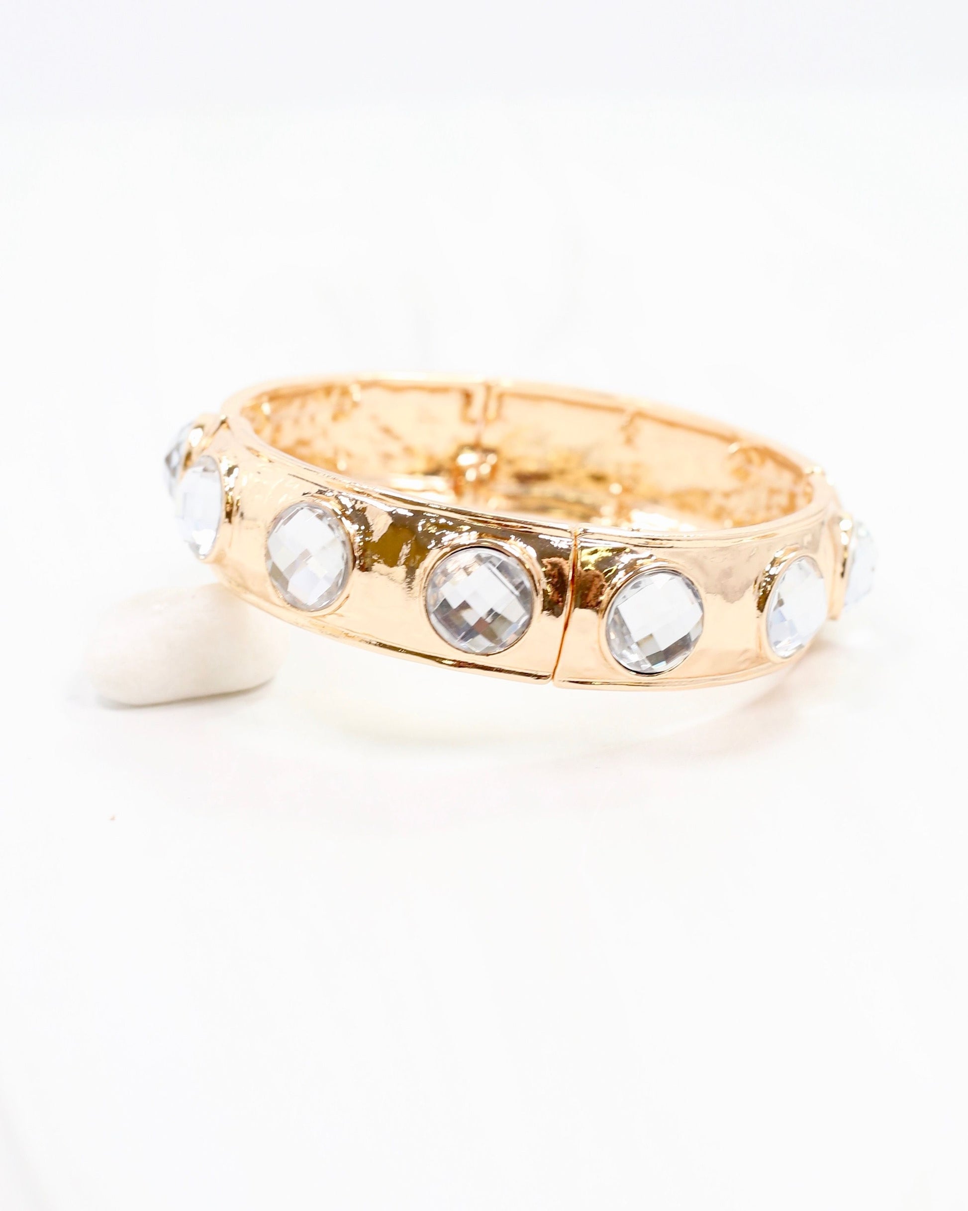 Add a touch of sass to your wrist with the Reagan Stretch Bracelet in clear. Versatile and stackable, its round clear faceted stones bring a pop of sparkle to your accessory game. The hammered gold bangle adds a touch of elegance, while the stretch style ensures a perfect fit.
