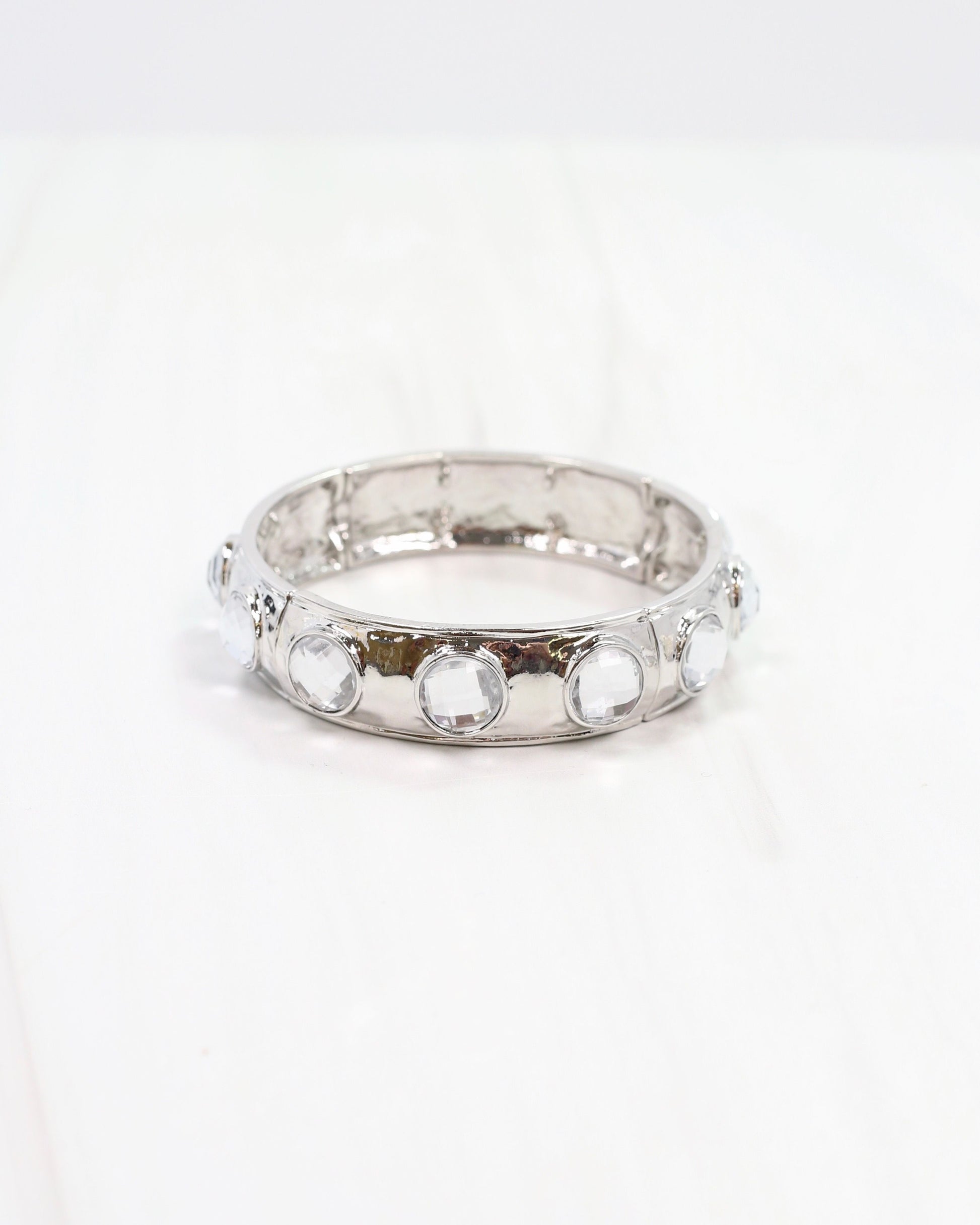 Add a touch of sass to your wrist with the Reagan Stretch Bracelet in Silver. Versatile and stackable, its round clear faceted stones bring a pop of sparkle to your accessory game. The hammered silver bangle adds a touch of elegance, while the stretch style ensures a perfect fit.