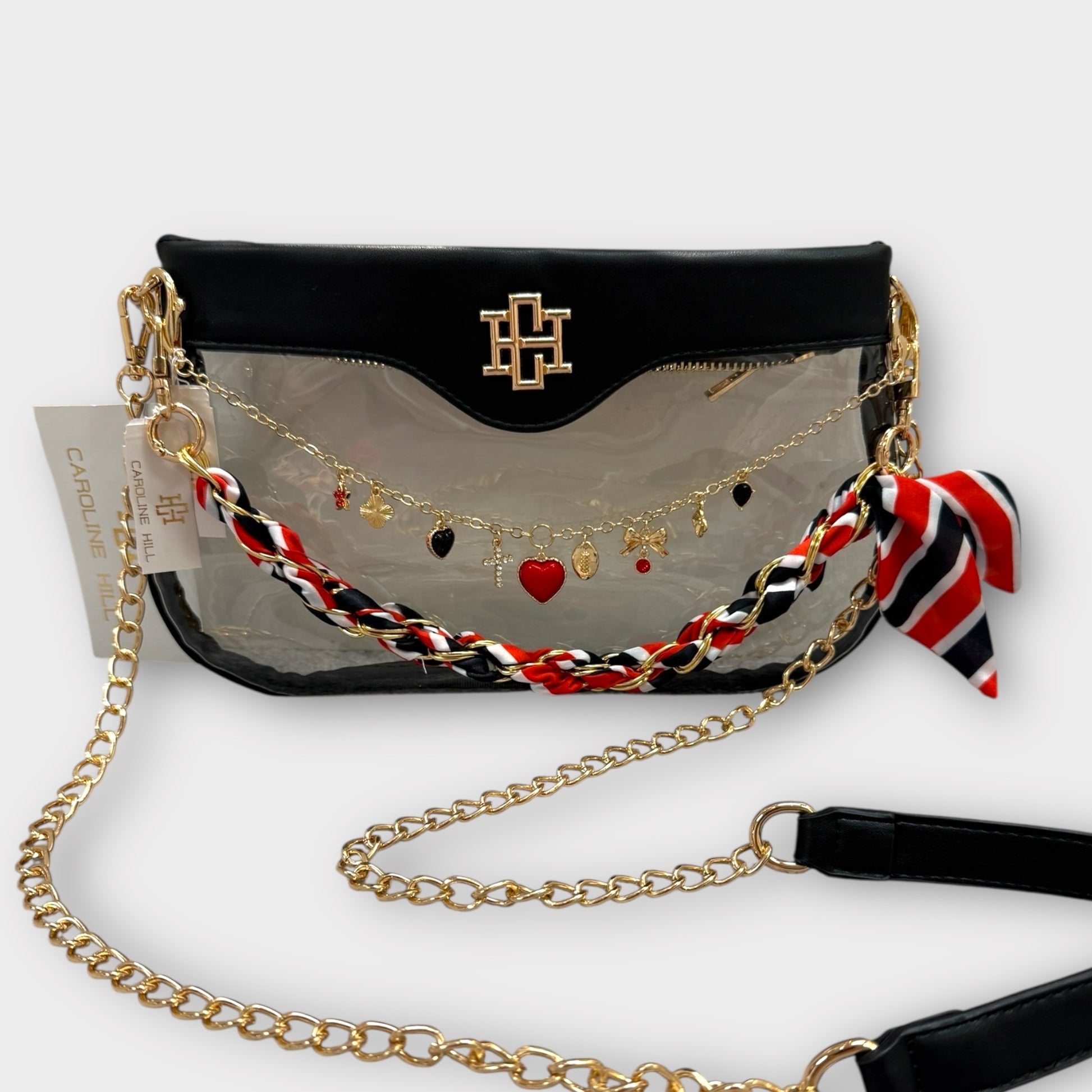 Elevate your game day look with the Red Black Stripe Clear Bag Bundle. This playful combo layers the sleek Avery Bag chain with the chic Serafina Scarf Chain, creating a stylish and functional accessory. Perfect for carrying essentials while showing off your spirited style with a touch of fun flair.