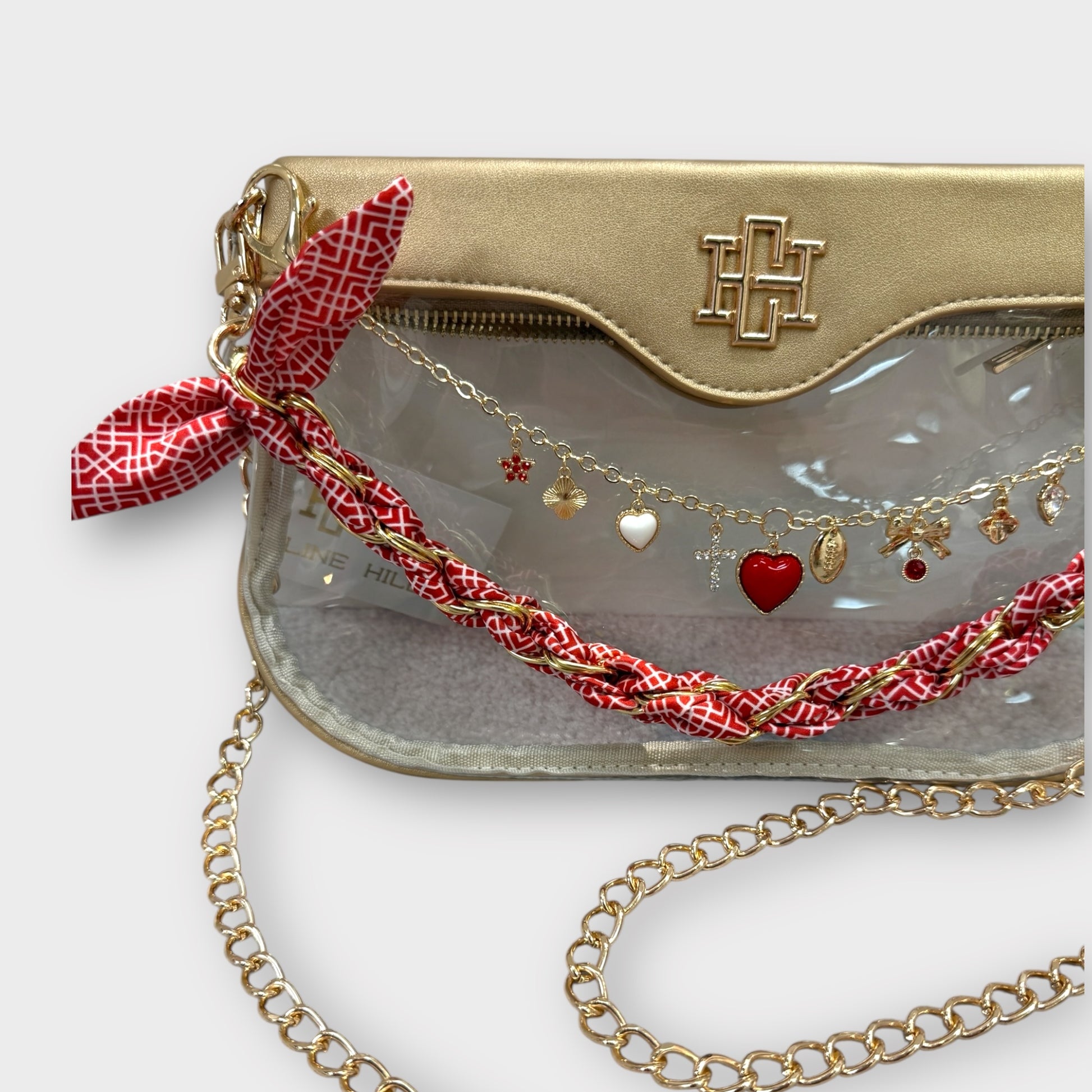 Elevate your game day look with the Red White Clear Bag Bundle. The Bag styled with the chain and scarf was hand picked by our owner, Jill. This playful combo layers the sleek Avery Bag chain with the chic Serafina Scarf Chain, creating a stylish and functional accessory. Perfect for carrying essentials while showing off your spirited style with a touch of fun flair.