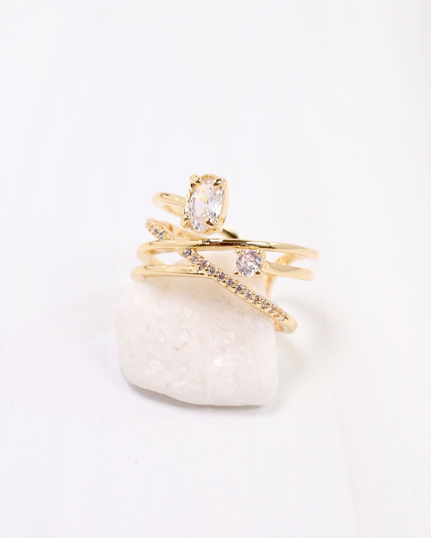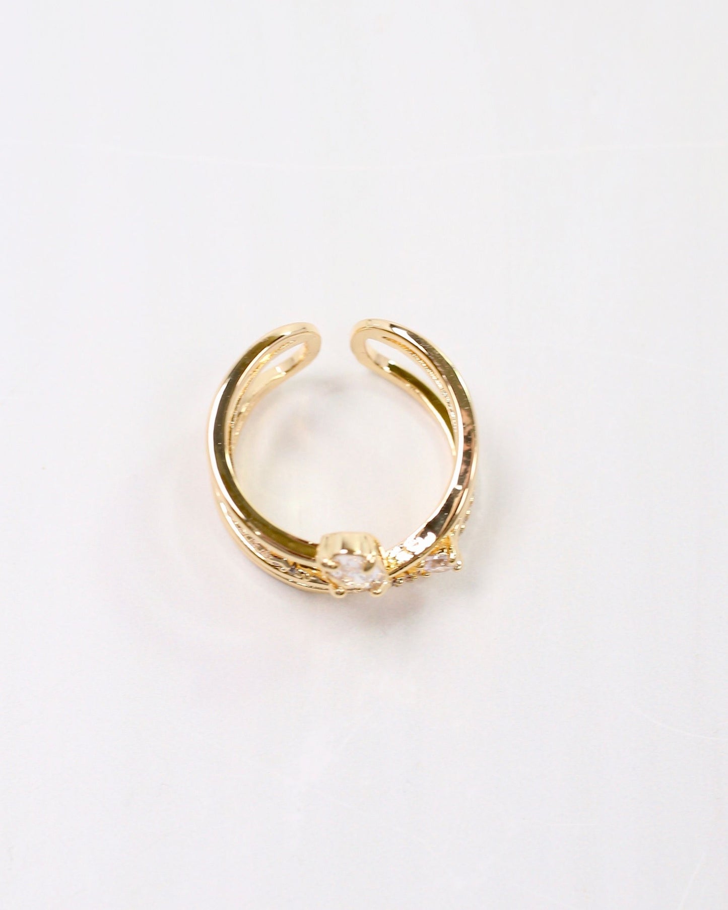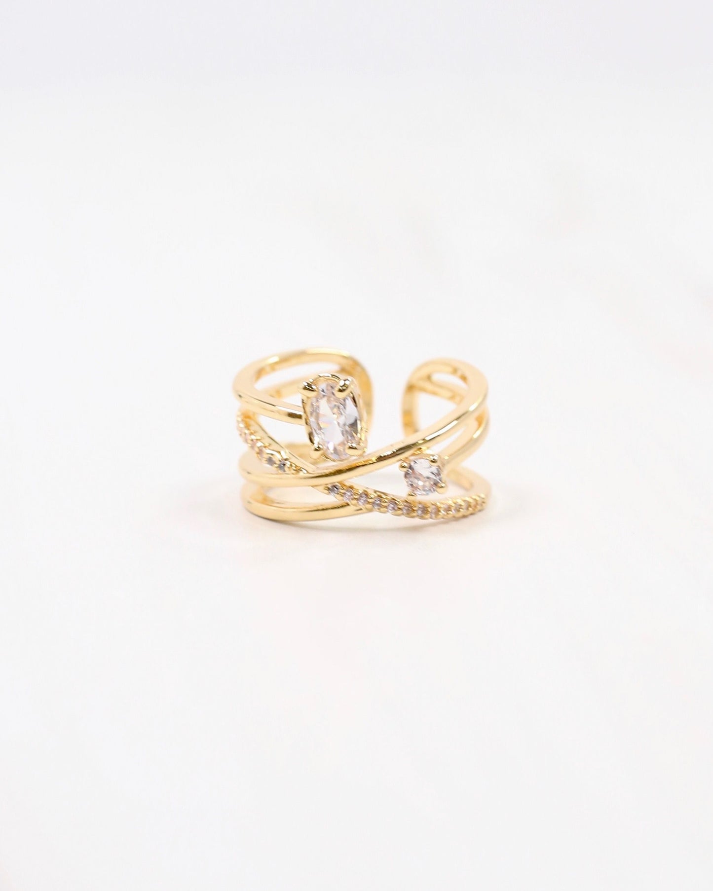 Elevate your style with the Reneau Crisscross Ring in Gold. This adjustable multi-layer design features an elegant oval cubic zirconia, creating the illusion of stacked rings in one refined piece. Perfect for adding a touch of sophistication to any outfit.