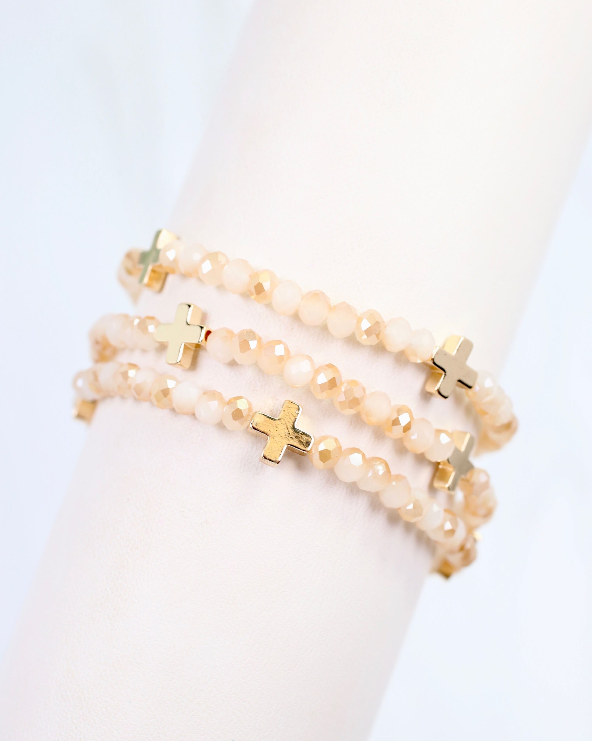 Discover spiritual style with the Riversprings Cross Beaded Bracelet Set in Champagne. This multi-piece collection combines elegant beaded bracelets with cross-adorned accents in warm champagne hues. Layer them together for a bold statement or wear individually for understated sophistication. The neutral tone works with any wardrobe, while the meaningful cross design adds personal significance. Whether you're seeking a thoughtful gift or expanding your own jewelry collection, this versatile set offers endless styling possibilities.