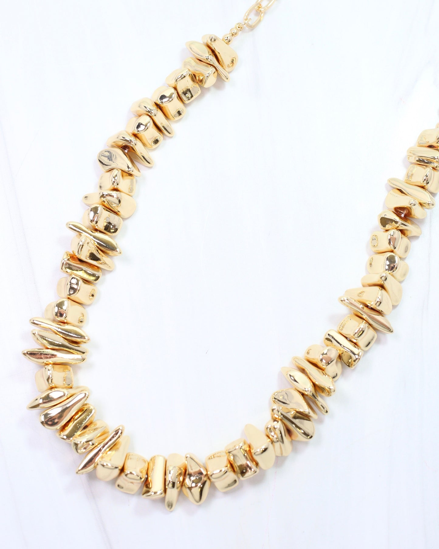 Dazzle and delight with our gold-toned Rock Candy Chunky Necklace! This fun statement piece features varied shapes and sizes for that perfect "Rocky Look" that'll make any outfit pop!
