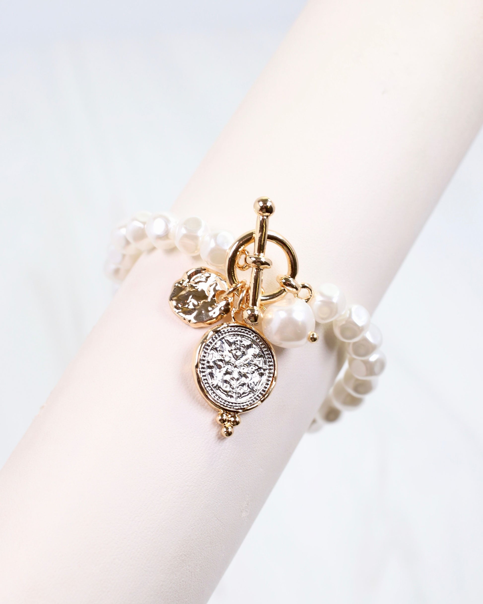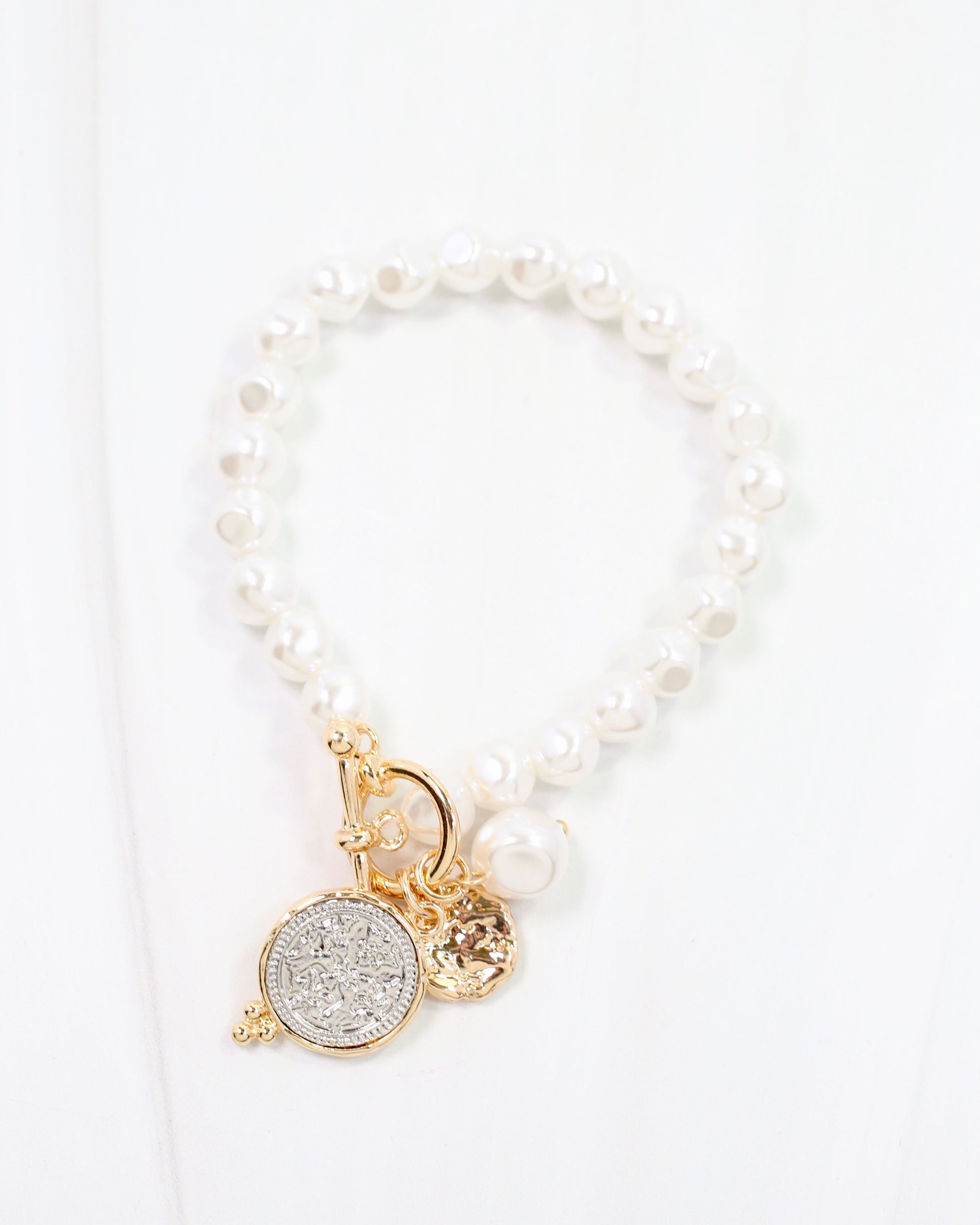 Elegant cream pearl beaded bracelet with decorative coin charms. Features lustrous pearls and a sophisticated layered design. Adjustable fit for all wrist sizes. Perfect for everyday wear or special occasions.