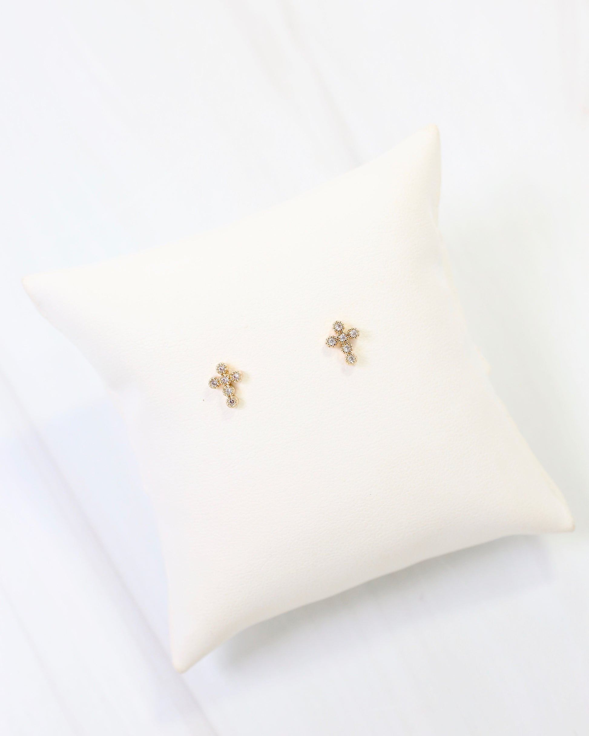 Channel timeless grace with the Royal Oak CZ Cross Stud Earrings in gold. These elegant studs feature a delicate cross design adorned with sparkling cubic zirconia stones that deliver brilliant sparkle without the price tag. The warm gold finish adds a touch of luxury while the classic cross silhouette works with virtually any aesthetic. Whether you're dressing up for a special occasion or elevating your daily style, these versatile earrings offer sophisticated charm that never goes out of fashion.