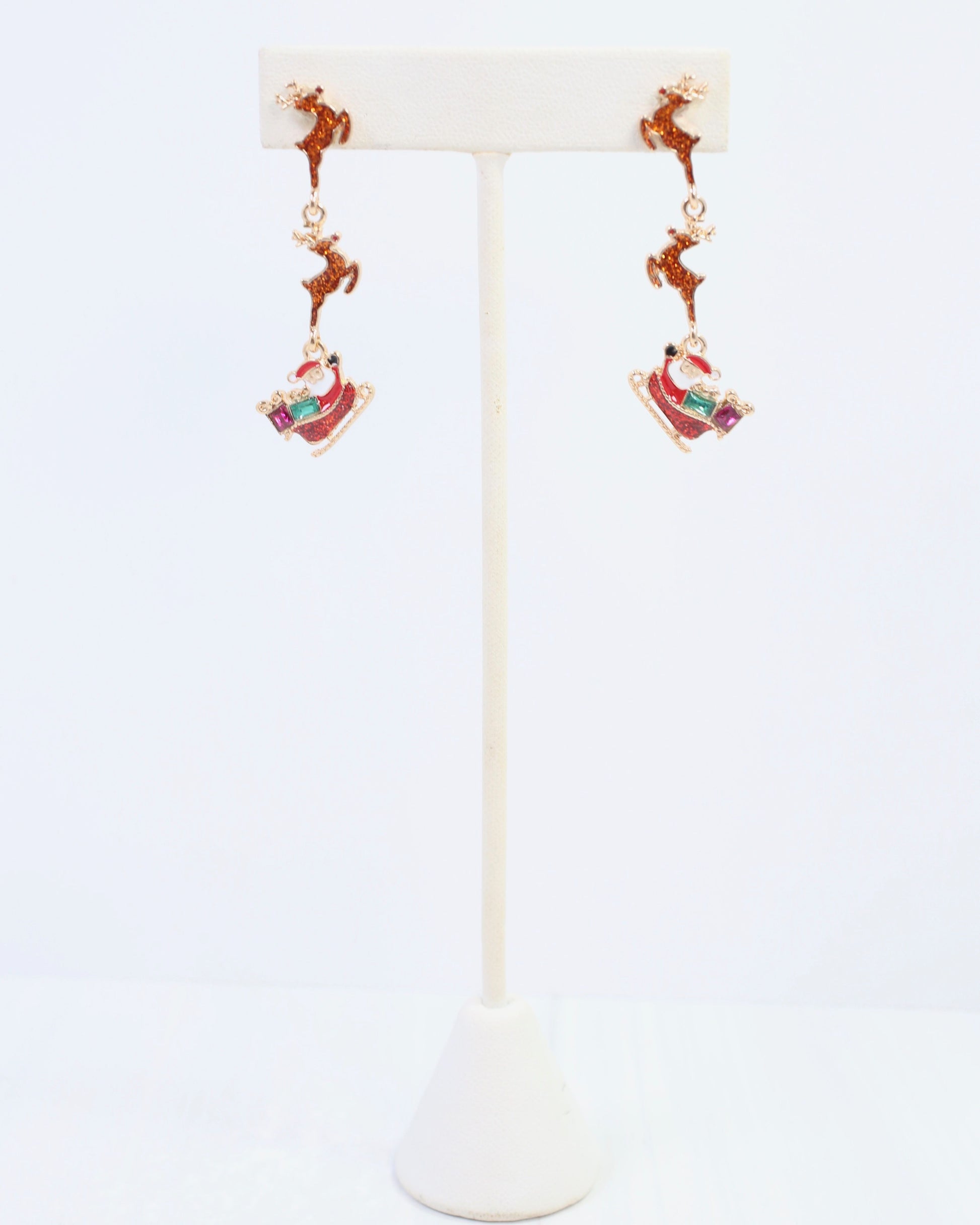 Make a festive statement with the Rudolph Rules Earring in Red. Featuring a stack of brown reindeer with bright red noses carrying Santa’s colorful enamel sleigh, this glittered design adds a playful and stylish touch to your holiday ensemble. Perfect for spreading seasonal cheer with a fashionable edge.