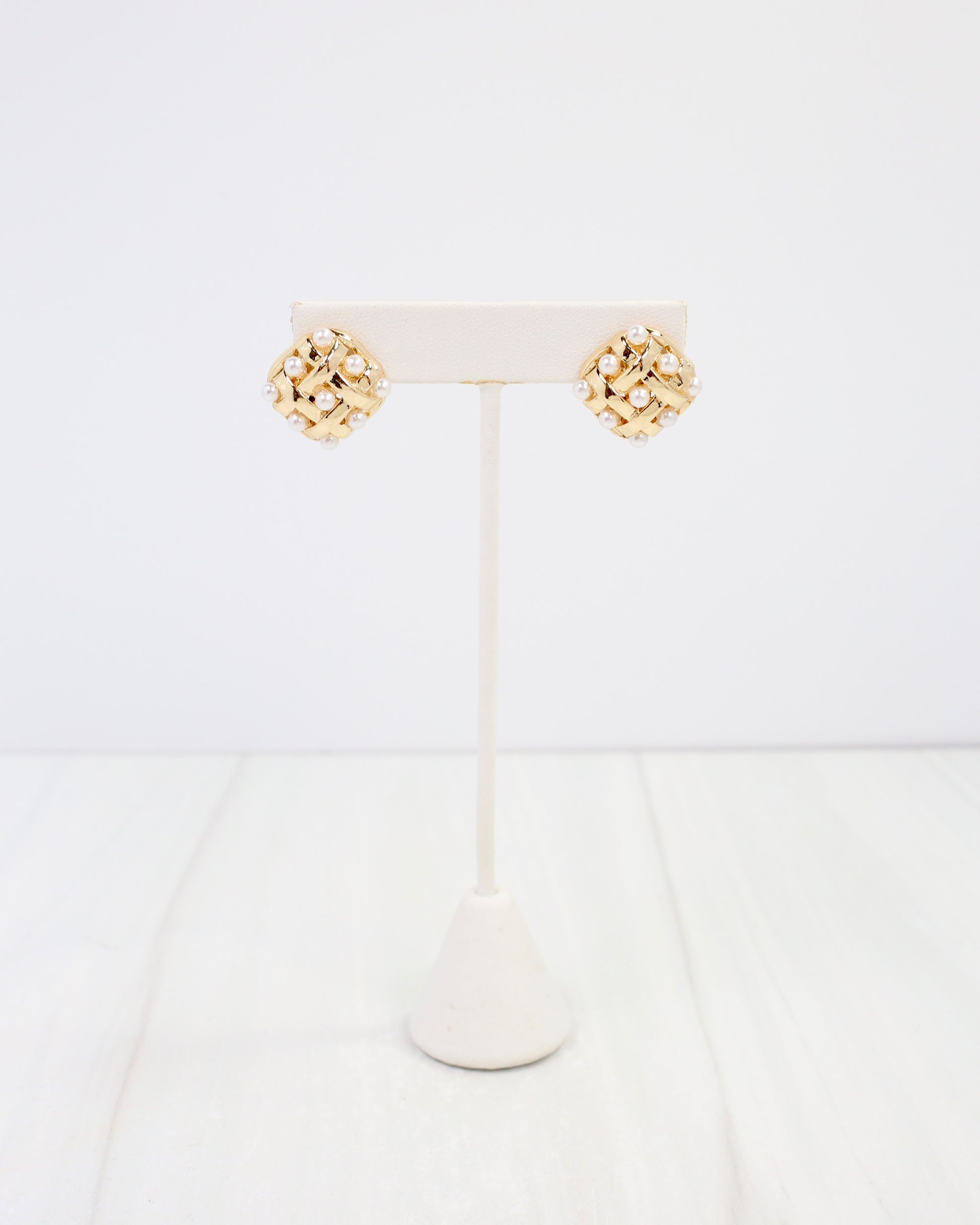 The Salina Pearl Embellished Stud Earrings in Gold bring a playful twist to classic style. Featuring a unique basket weave design accented with radiant pearls, these studs add a chic sparkle that’s perfect for any occasion. Lightweight and versatile, they effortlessly elevate your look with fashionable ease.