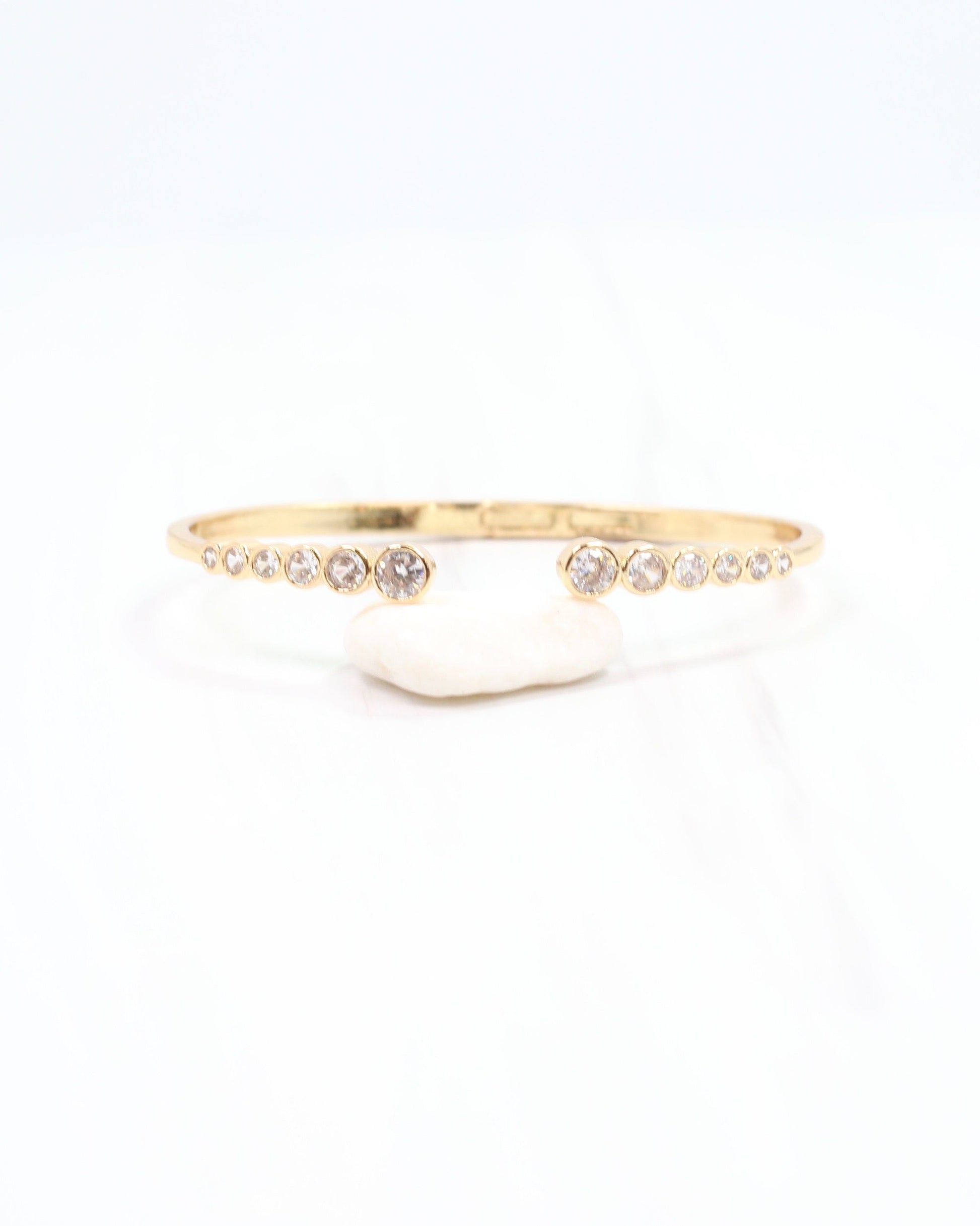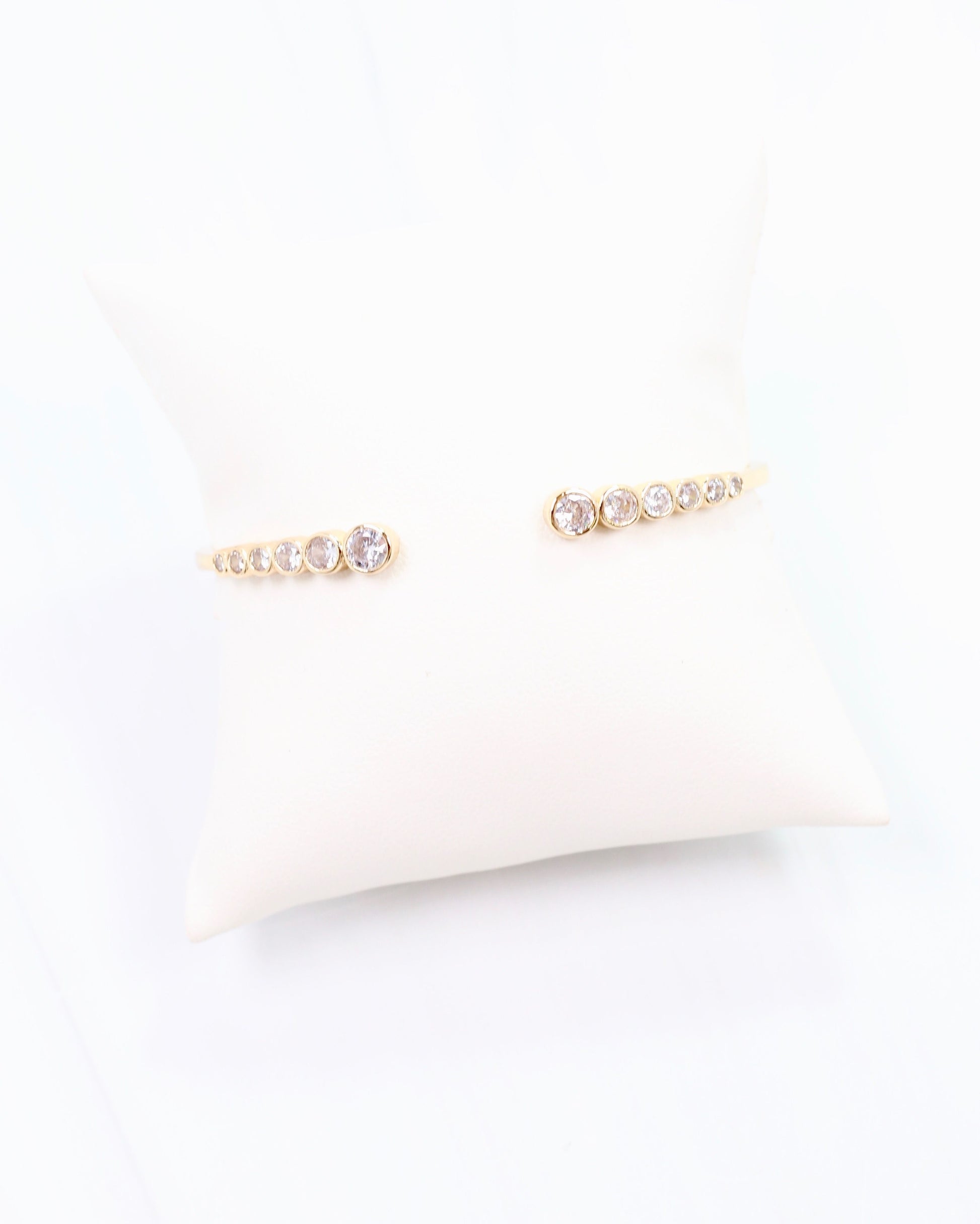 Add a touch of sparkle with the Samantha CZ Cuff Bracelet in Gold. This open cuff features a clever hinged back for easy wear, while graduated CZ circles create a dazzling statement that’s sure to turn heads. Perfect for adding playful glam to any outfit!