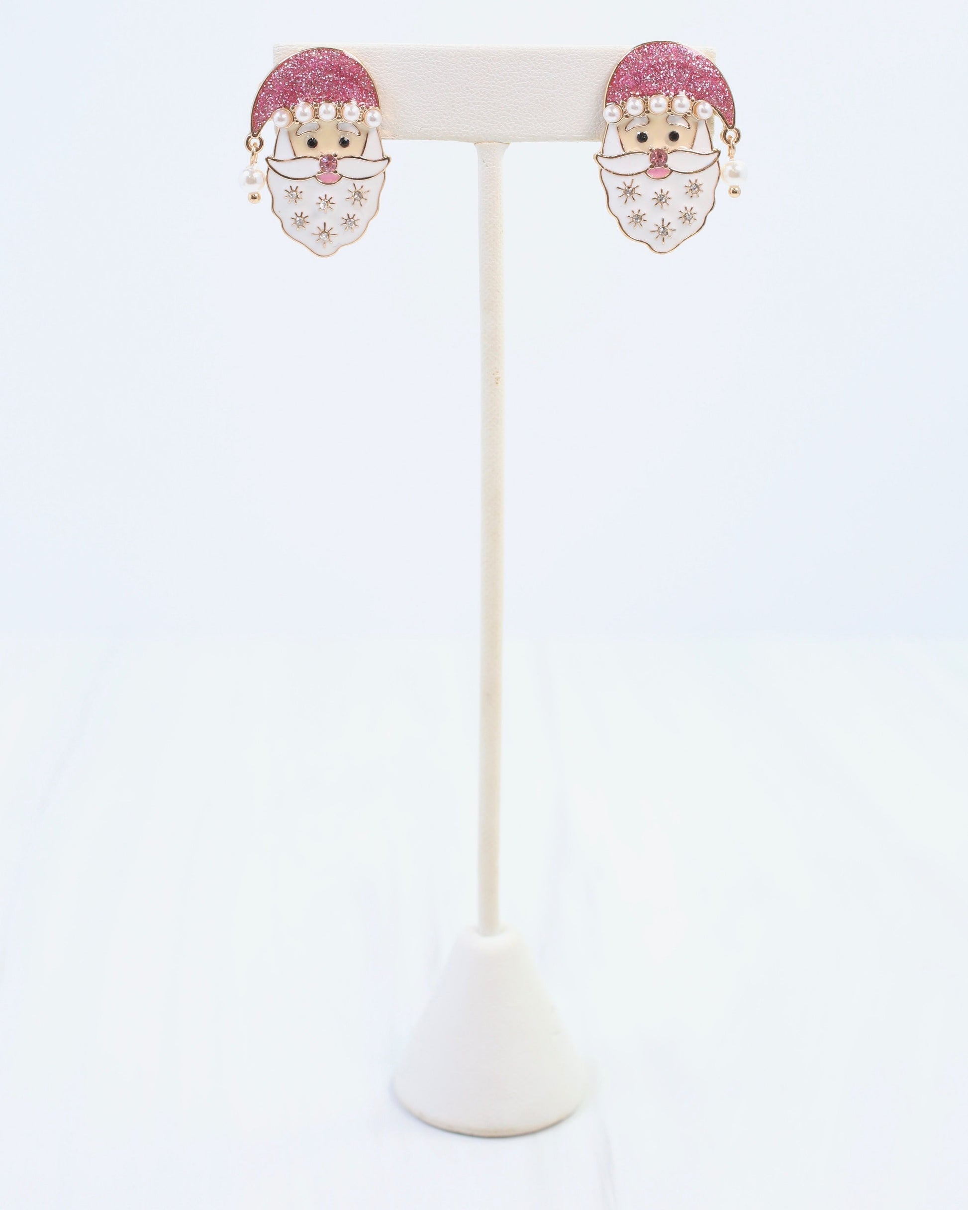 Add festive charm with these pink Santa enamel earrings, featuring a glittered hat trimmed with pearls, a crystal-studded beard, and a delicate pearl drop for a stylish holiday look.