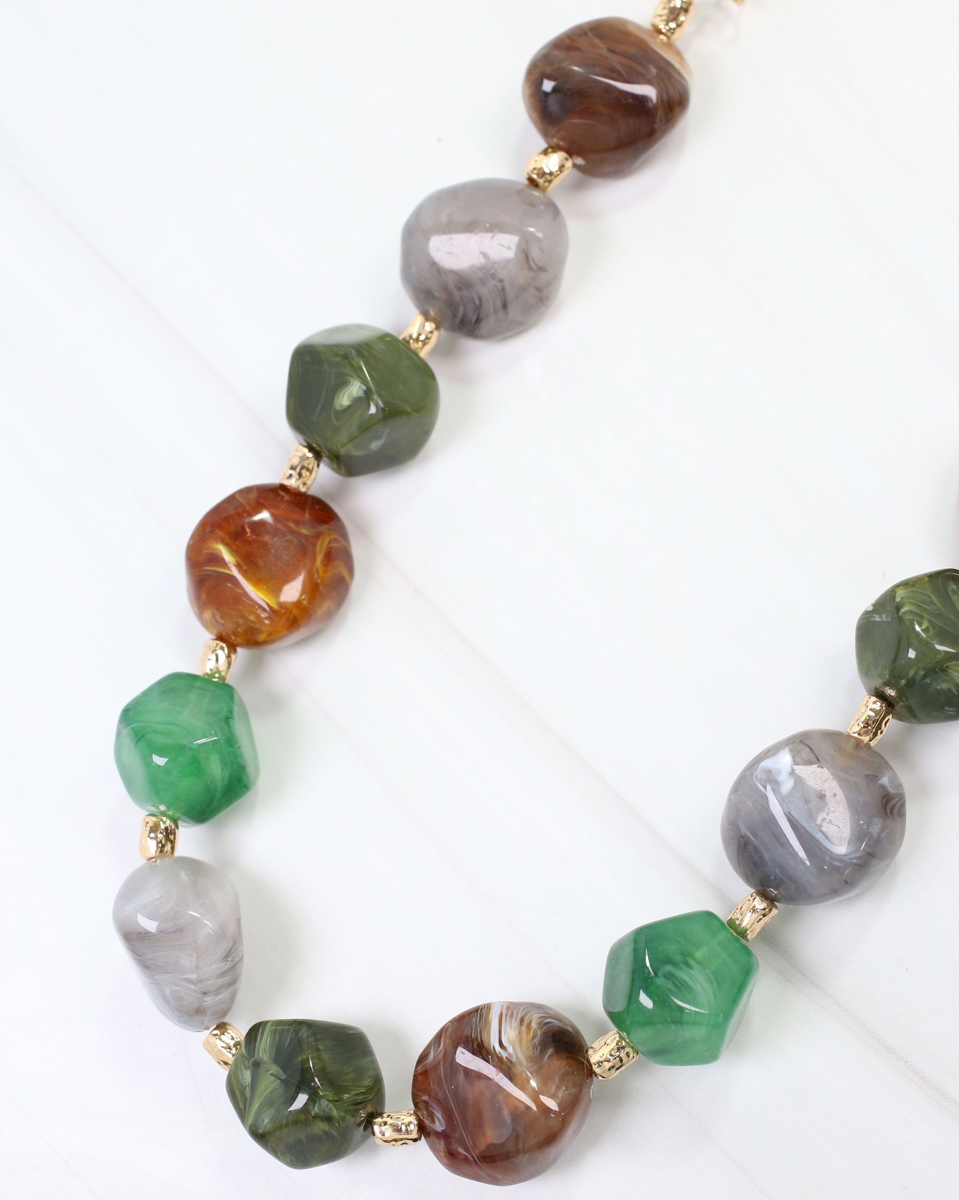 The Scarborough Stone Necklace in green multi brings natural elegance to your accessory collection. Featuring a harmonious blend of green-toned stones, this piece offers earthy sophistication with subtle color variation. Versatile enough for everyday wear yet distinctive enough to elevate your style, it pairs effortlessly with any wardrobe.