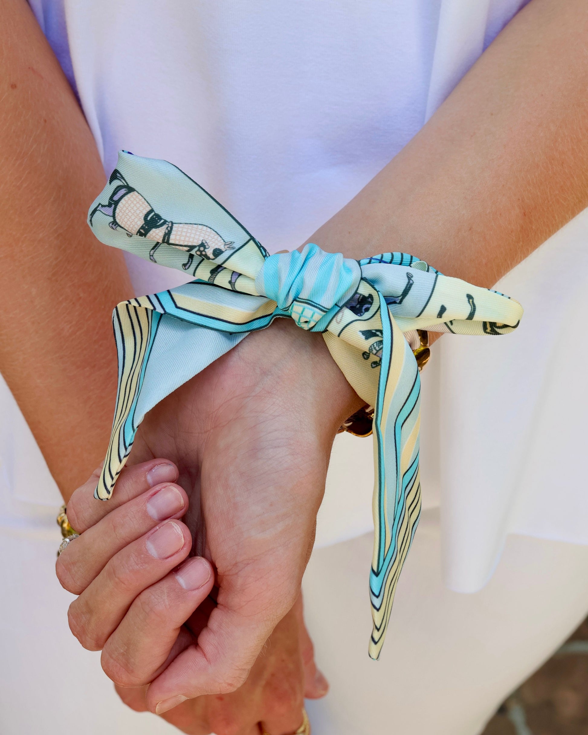 Add a pop of vibrant blue to your look with the Sedgefield Scarf Bracelet. This silky satin scarf weaves through a shiny gold cuff featuring textured and beaded edges for a chic, playful touch. Wear it tied in a bold bow for a fun statement or knot it smaller for a sleek, stylish vibe. Gold Dipped Stainless Steel. Water Resistant. Versatile and eye-catching, it’s the perfect accessory to brighten any outfit.
