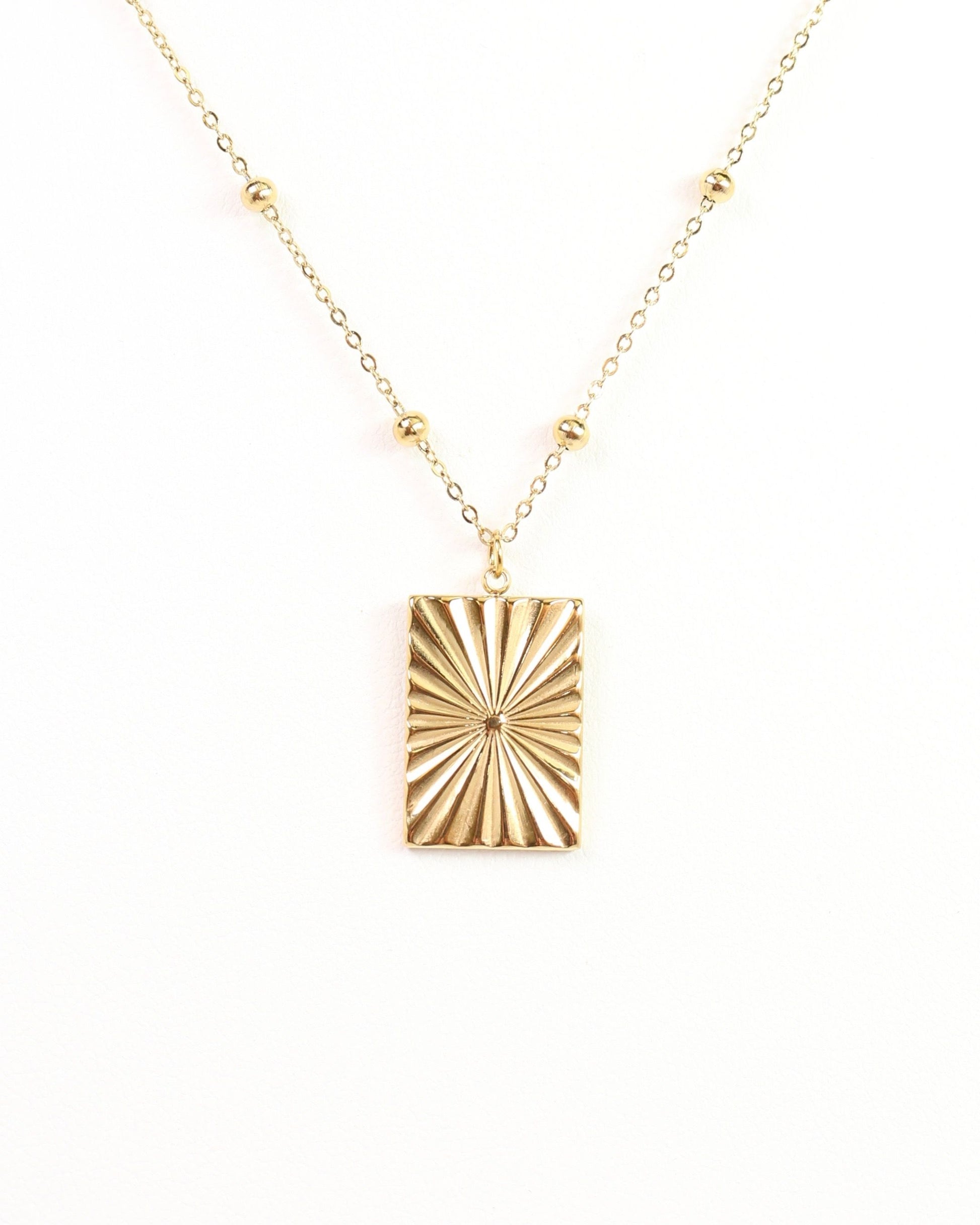 Add a touch of sparkle with the Selby Charm Necklace in Gold. Featuring a ribbed rectangular plate charm that catches the light, this playful piece hangs on a delicate gold dotted chain. Made from water-resistant stainless steel, it’s perfect for everyday wear with a hint of fun and shine.