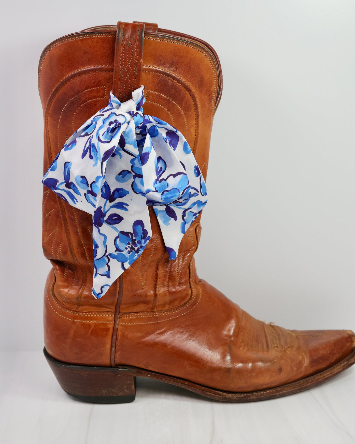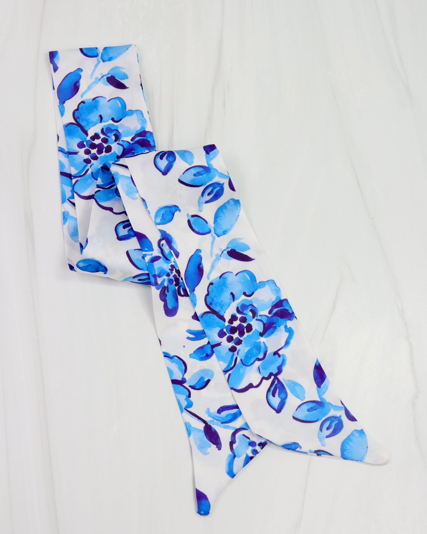 Add a stylish touch to any outfit with the Serafina Scarf in a beautiful Blue and White floral print. Its smooth satin-like texture makes it perfect for tying around your neck, wrist, bag, or even your cowgirl boots, adding a playful and fashionable flair wherever you wear it.