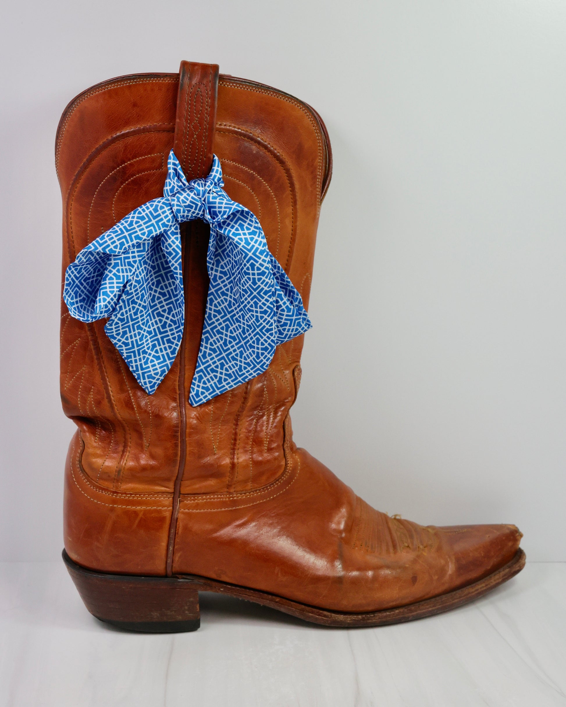 Add a stylish touch to any outfit with the Serafina Scarf in a classic blue and white geometric print. Its smooth satin-like texture makes it perfect for tying around your neck, wrist, bag, or even your cowgirl boots, adding a playful and fashionable flair wherever you wear it.