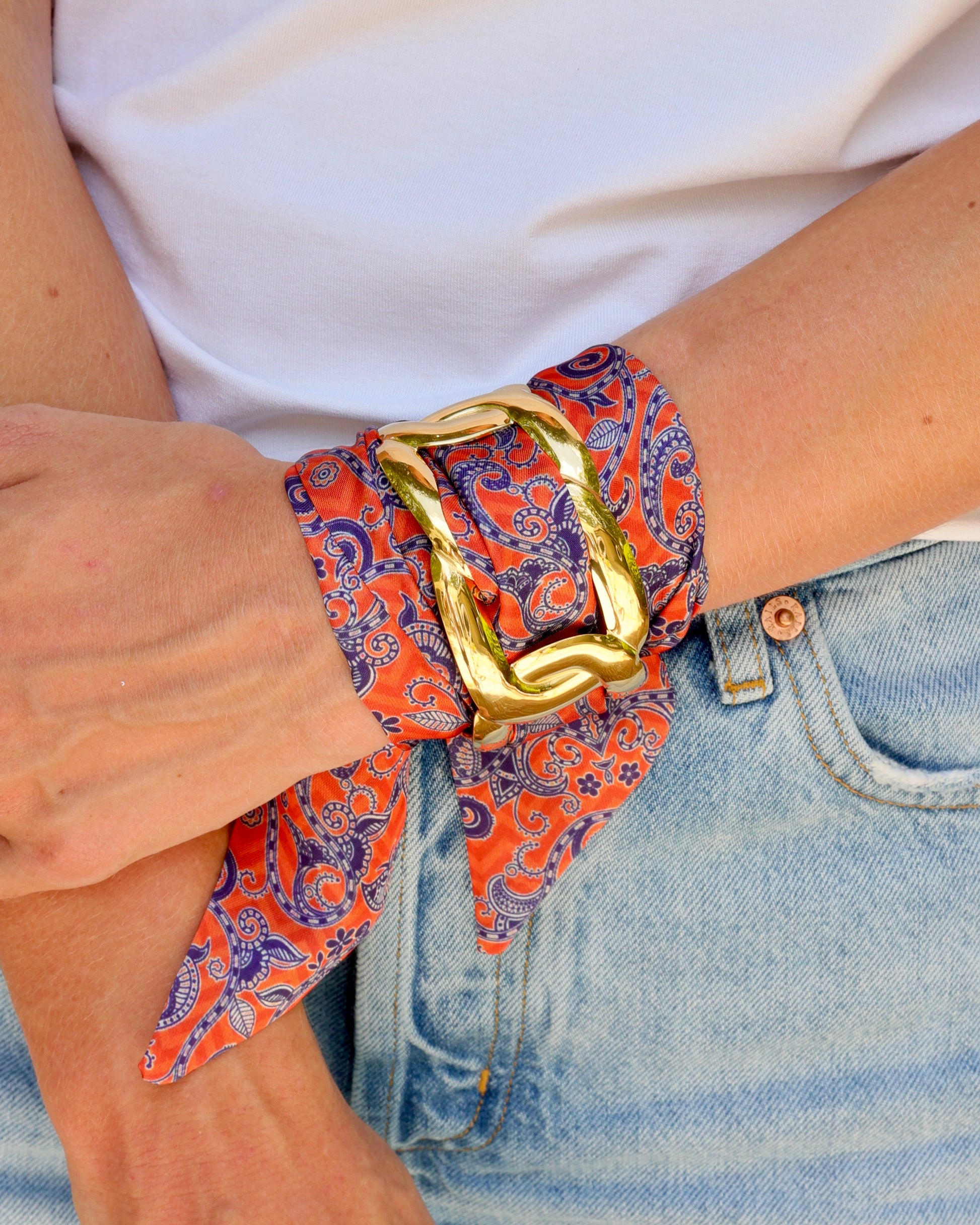 Elevate your game day style with the Serafina Scarf Bracelet. This fashionable accessory features a sleek stainless steel adjustable cuff threaded with a vibrant scarf, making it easy to show off your team colors in a chic and effortless way. Perfect for adding a stylish pop of color to your outfit while keeping comfort and versatility in mind.