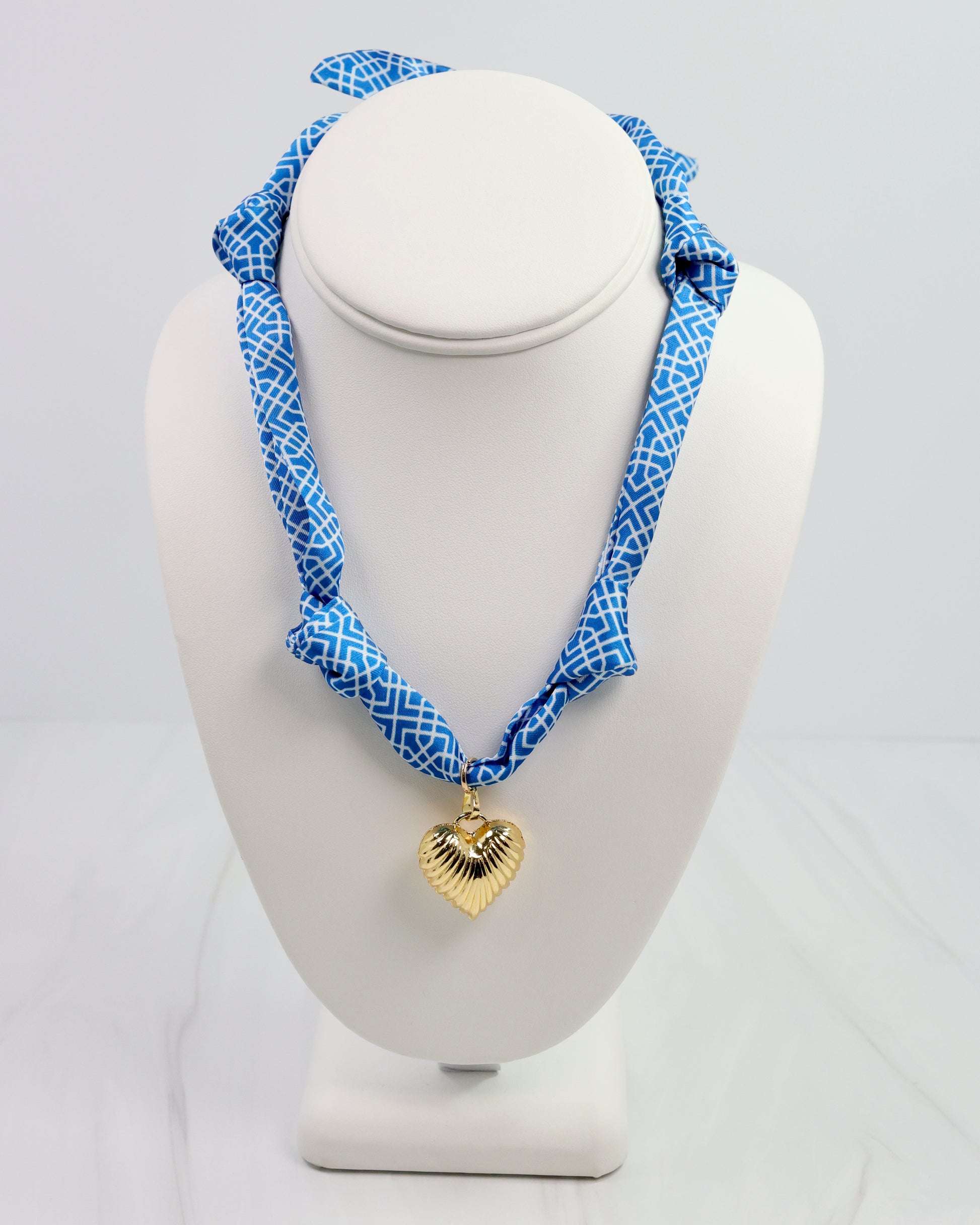 Elevate your look with the Serafina Scarf Charm Necklace featuring a fun Blue and Orange print. This satin-feel scarf is accented by a ribbed puff heart charm pendant, adding a playful yet chic touch. Designed with two stylish knots and a tie-back closure, it offers adjustable comfort and a perfect fit for any outfit.