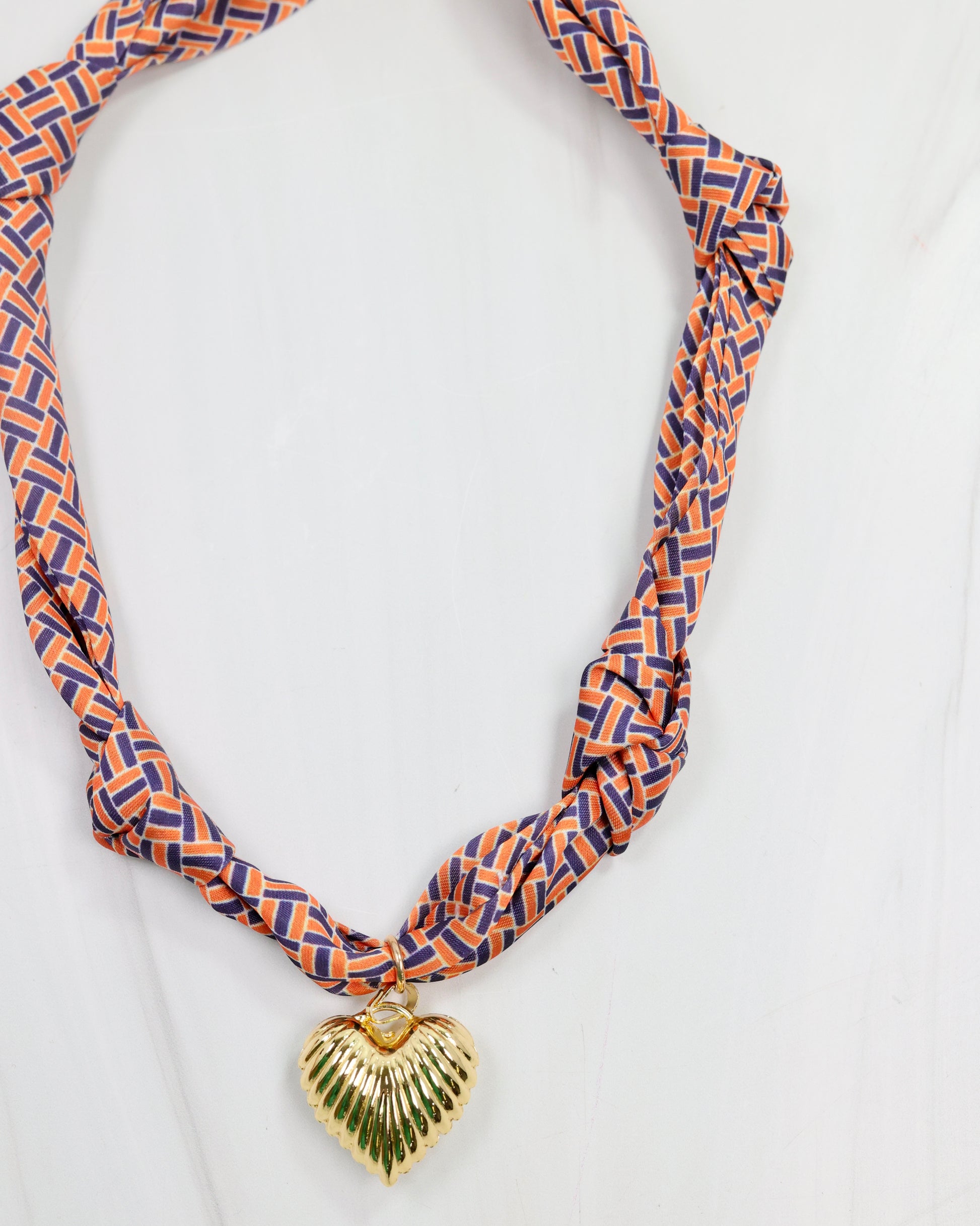 Elevate your look with the Serafina Scarf Charm Necklace featuring a Navy and Orange print. This satin-feel scarf is accented by a ribbed puff heart charm pendant, adding a playful yet chic touch. Designed with two stylish knots and a tie-back closure, it offers adjustable comfort and a perfect fit for any outfit.