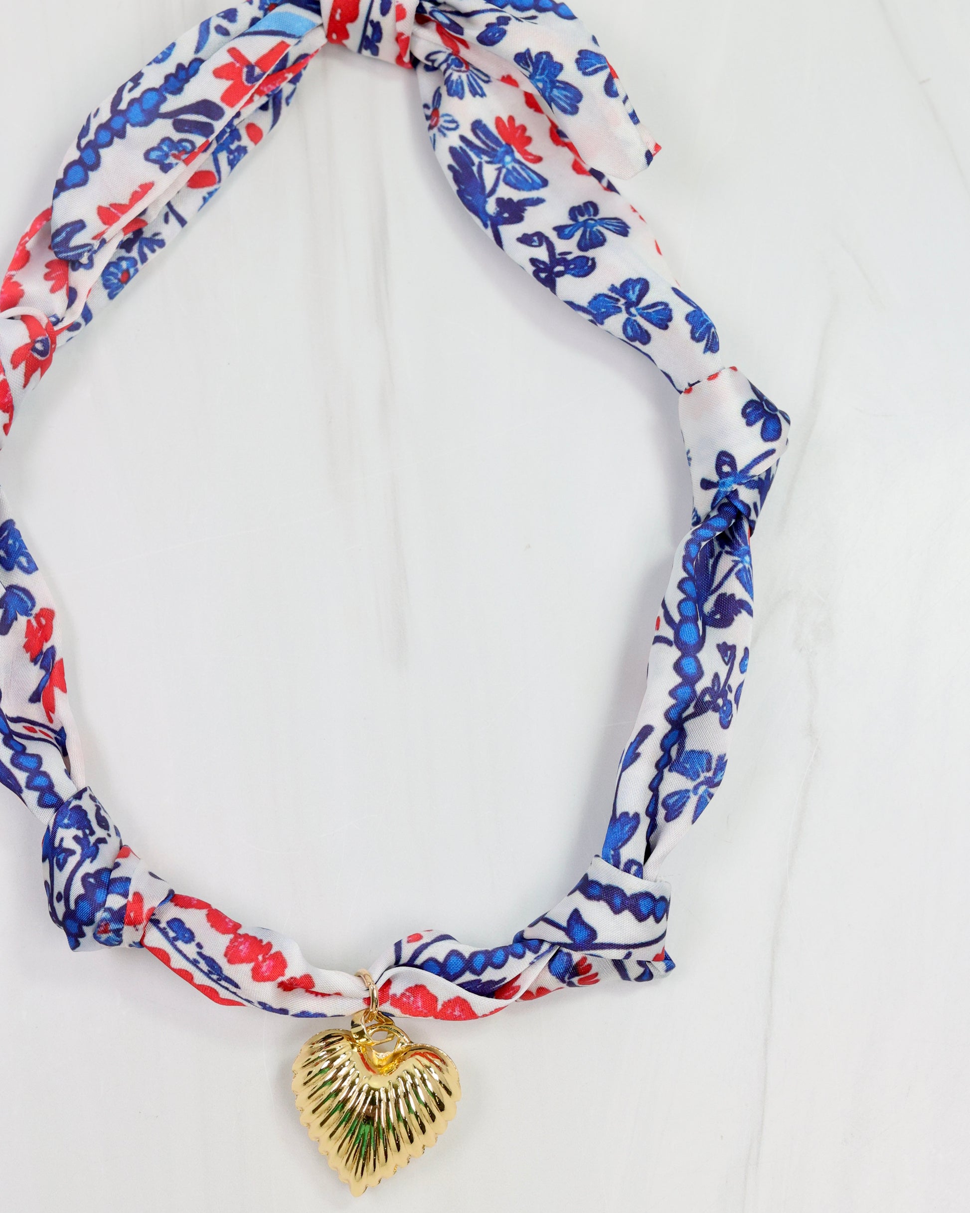 Elevate your look with the Serafina Scarf Charm Necklace featuring a beautiful Navy and Red Floral print. This satin-feel scarf is accented by a ribbed puff heart charm pendant, adding a playful yet chic touch. Designed with two stylish knots and a tie-back closure, it offers adjustable comfort and a perfect fit for any outfit.