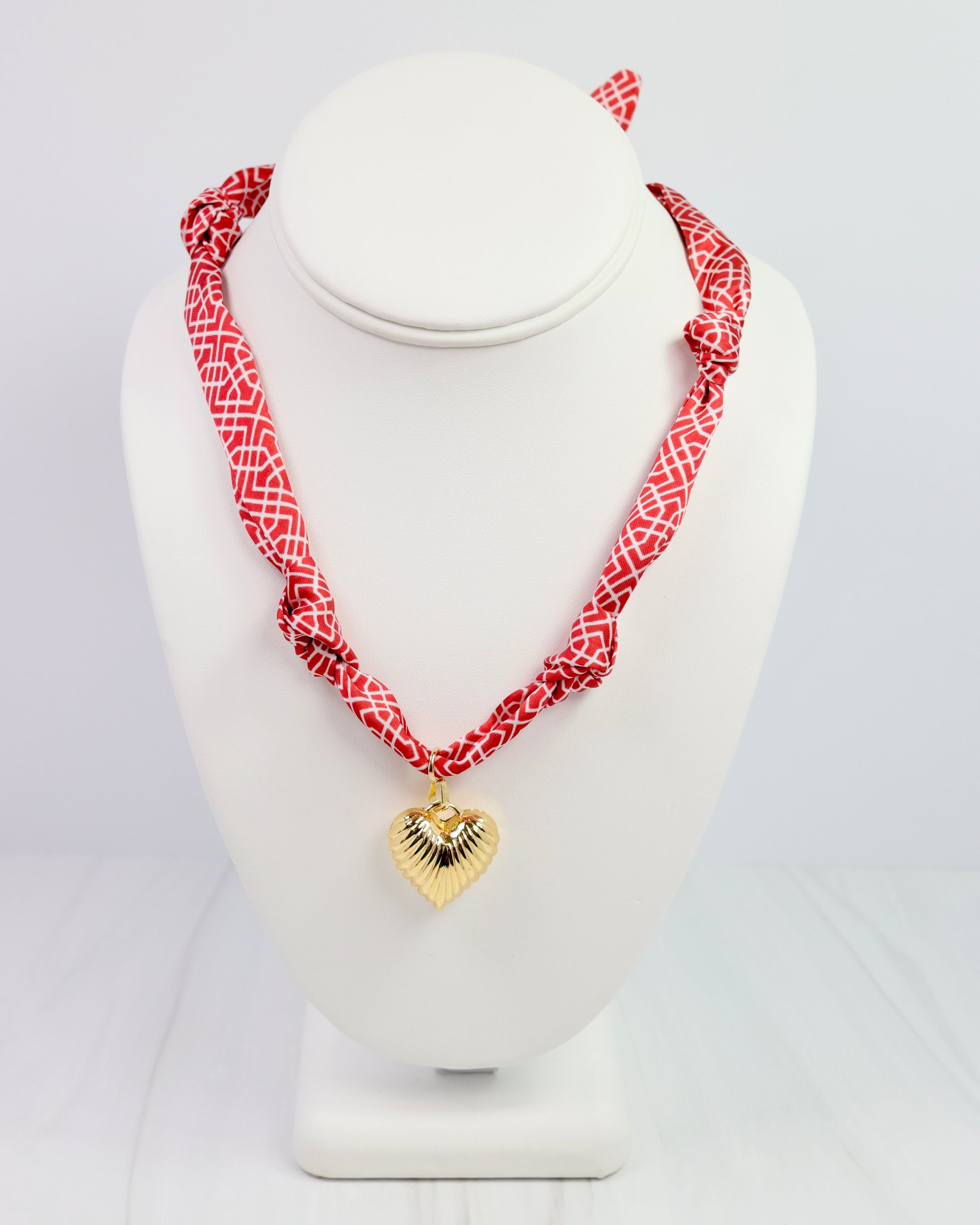 Elevate your look with the Serafina Scarf Charm Necklace featuring a striking red and white geometric print. This satin-feel scarf is accented by a ribbed puff heart charm pendant, adding a playful yet chic touch. Designed with two stylish knots and a tie-back closure, it offers adjustable comfort and a perfect fit for any outfit.
