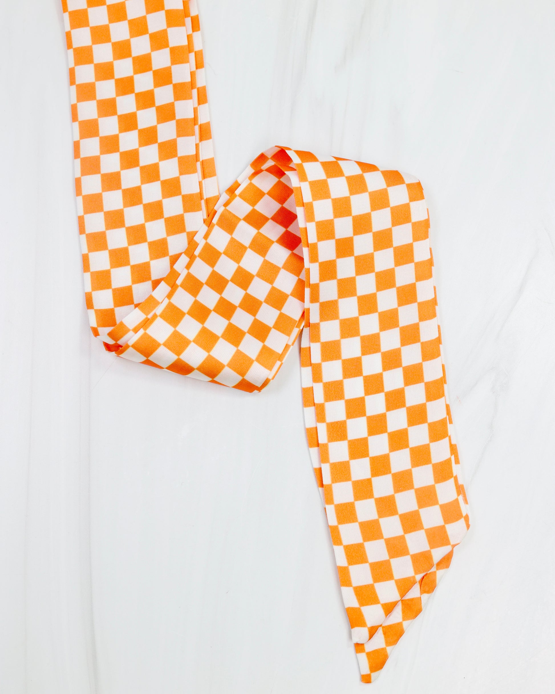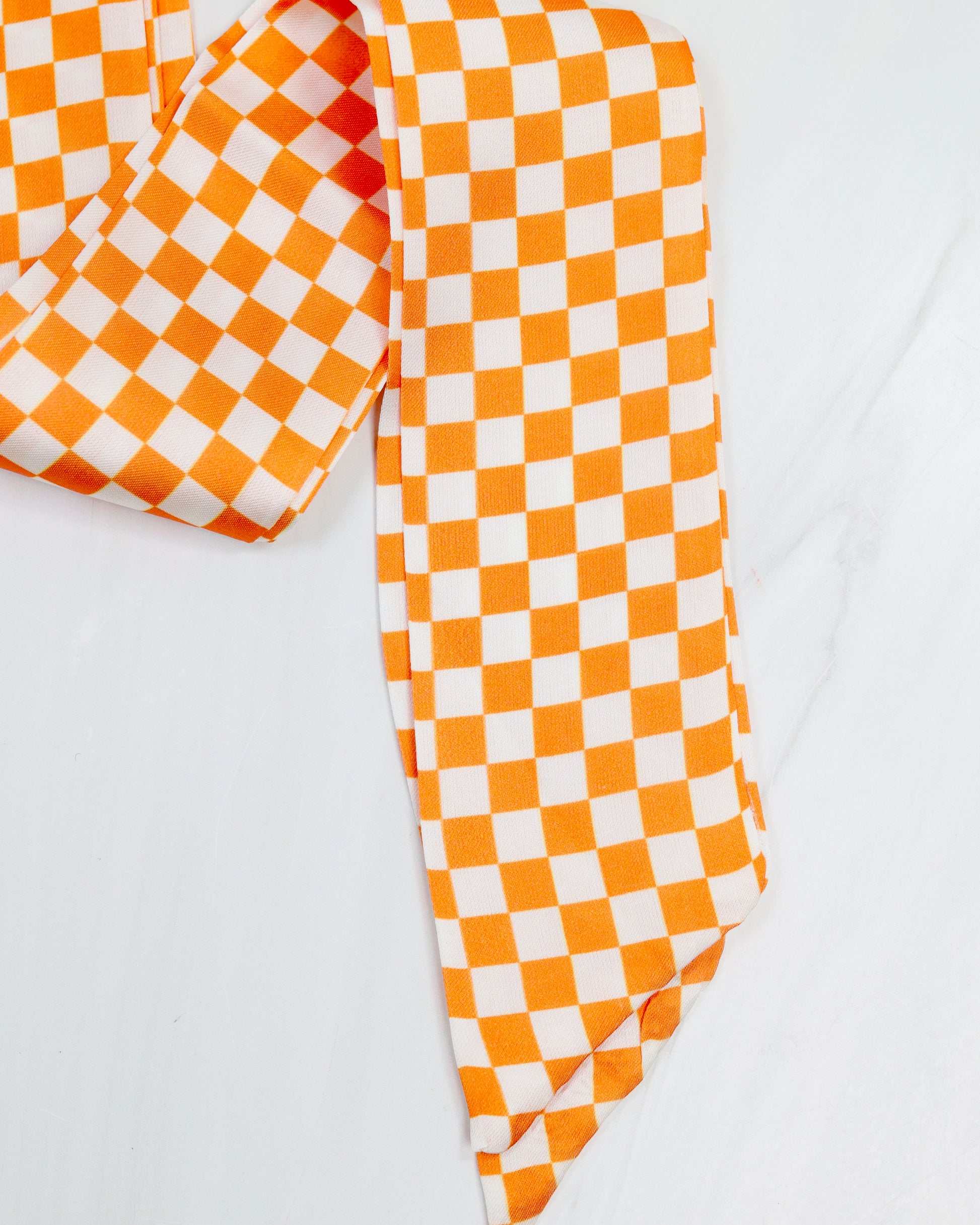 Add a stylish touch to any outfit with the Serafina Scarf in a classic Orange and White checked pattern. Its smooth satin-like texture makes it perfect for tying around your neck, wrist, bag, or even your cowgirl boots, adding a playful and fashionable flair wherever you wear it.